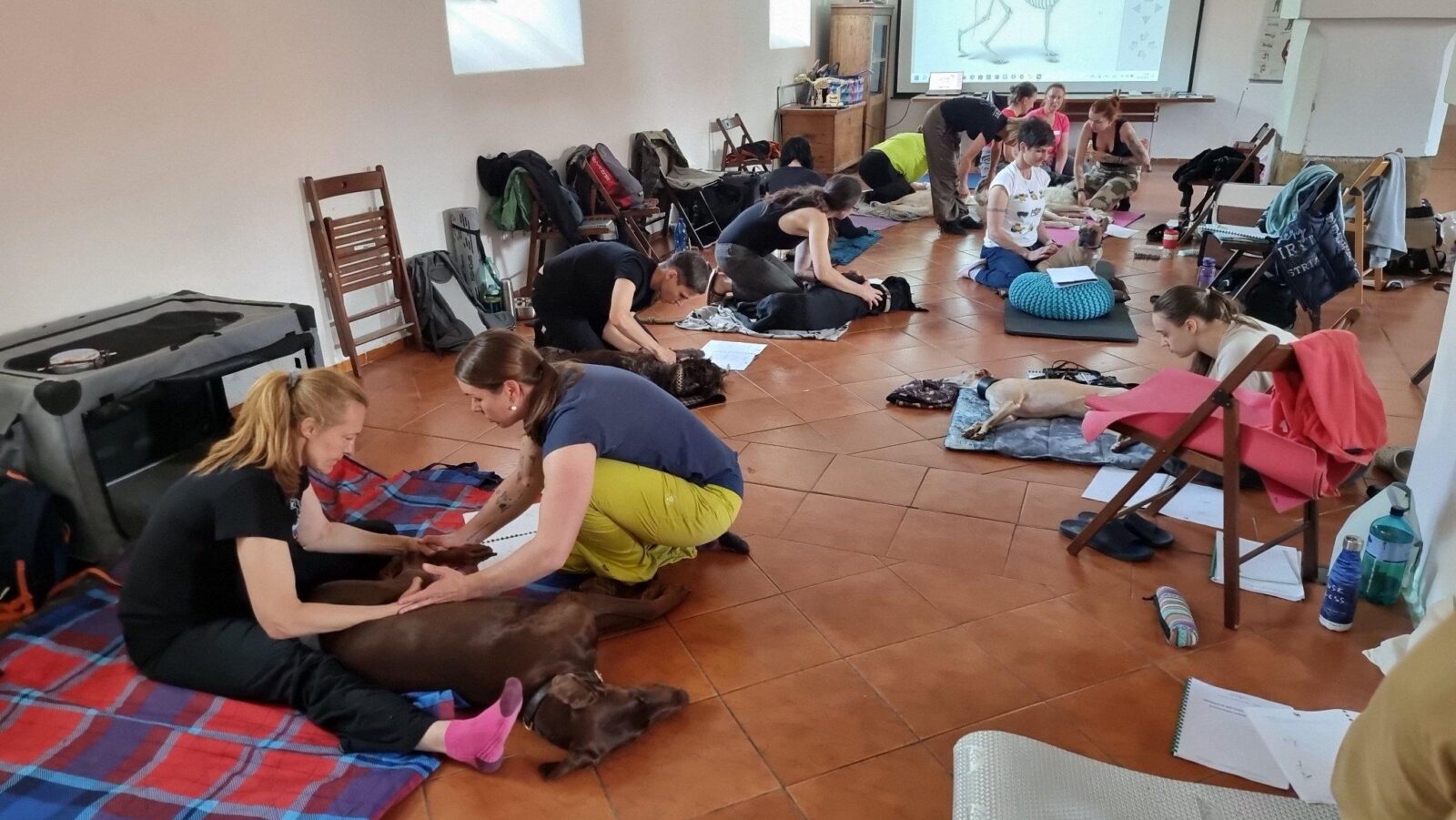 Přibližně třetinu našich svěřenců dlouhodobě tvoří psí babičky a dědečci. Podobně jako staří lidé mají svoje nemoci, se kterými navštěvujeme veterináře. Kromě toho je často trápí opotřebená záda, kolena, kyčle, zatuhlé svaly… a protože psí rehabilitace je tolik potřebná a terapeuti tolik vytížení, rozhodli jsme se, že se alespoň základní metodu naučíme sami, abychom mohli našim staroušům kdykoliv ulevit od bolesti. Dornova metoda se používá nejen při již vzniklých potížích, ale zároveň jako prevence. Kolegyně Iva Raisová se se svým adoptáčkem Arkerem přihlásili na kurz Dornovy metody pod vedením zakladatelky této metody v ČR, paní Andrey Dunové. Poslední květnový víkend se v Praze naučili jak teoretické části tak provádění praktické sestavy ošetření Dornovou metodou.