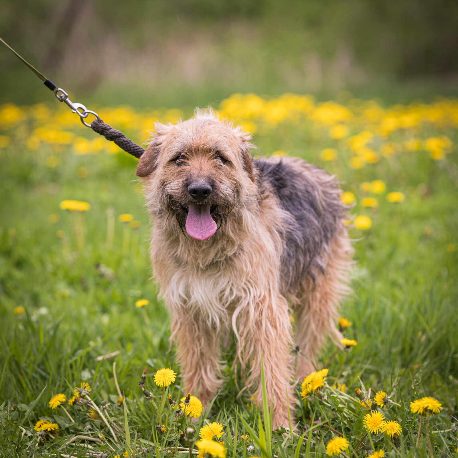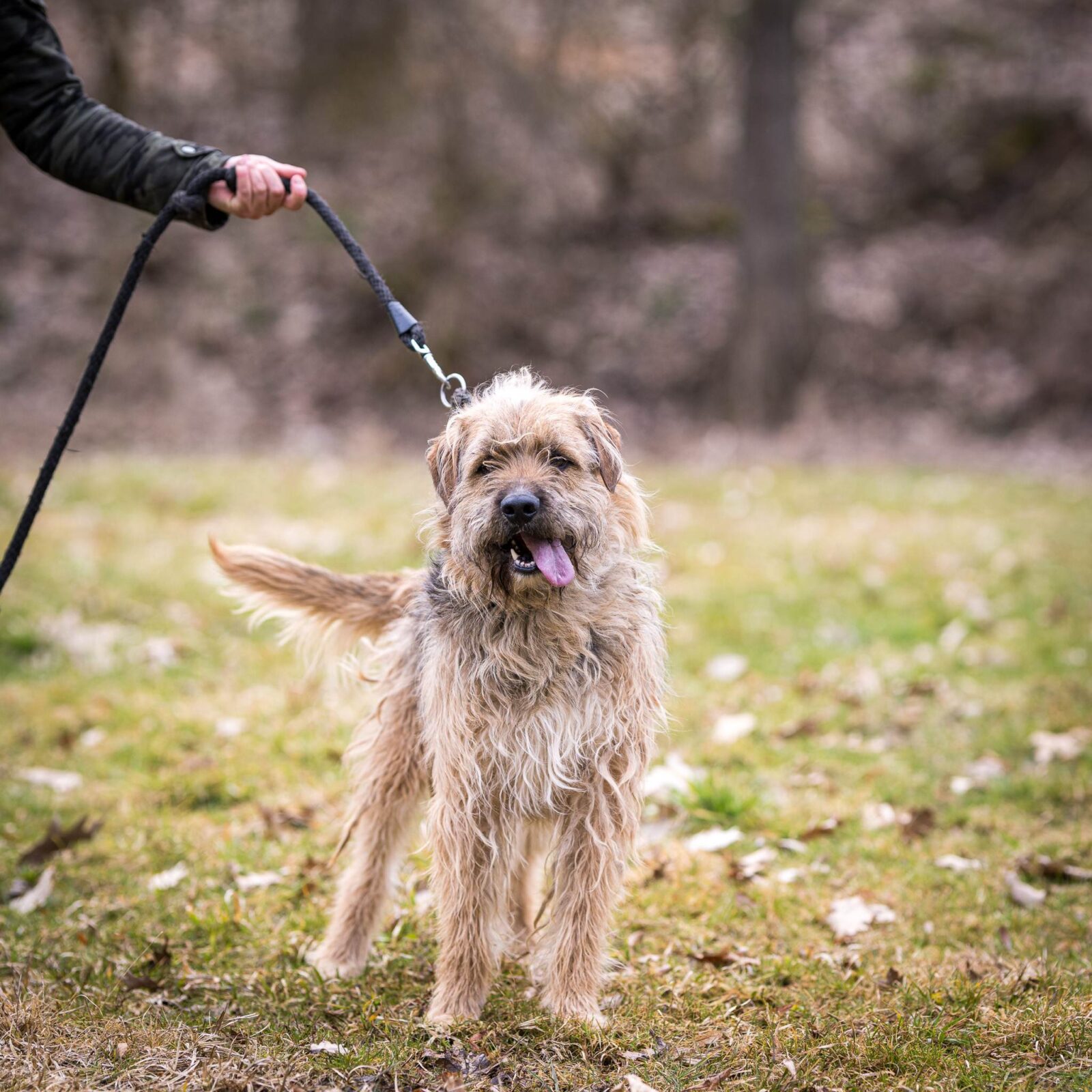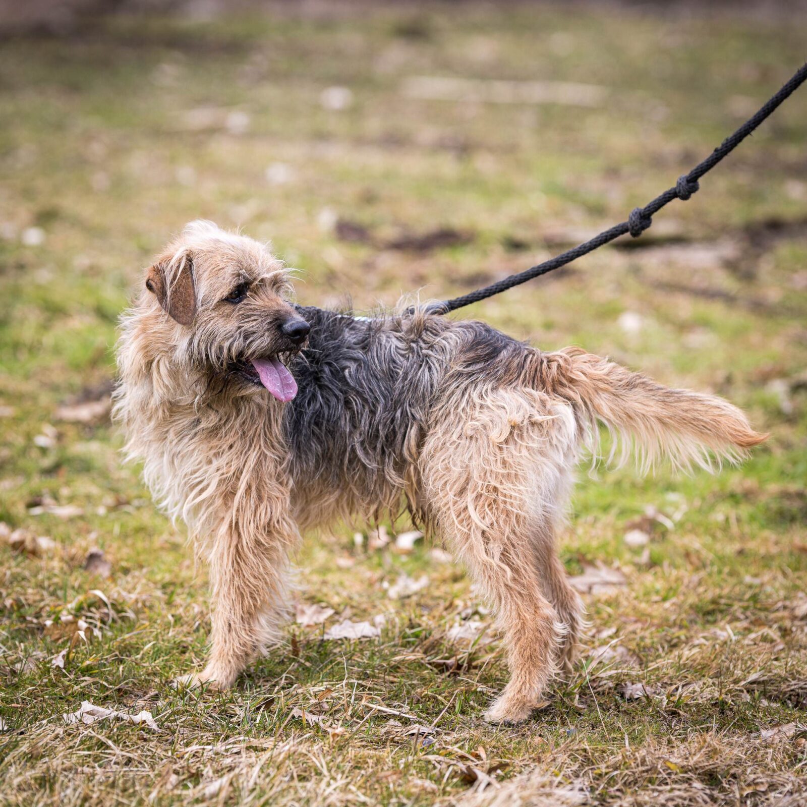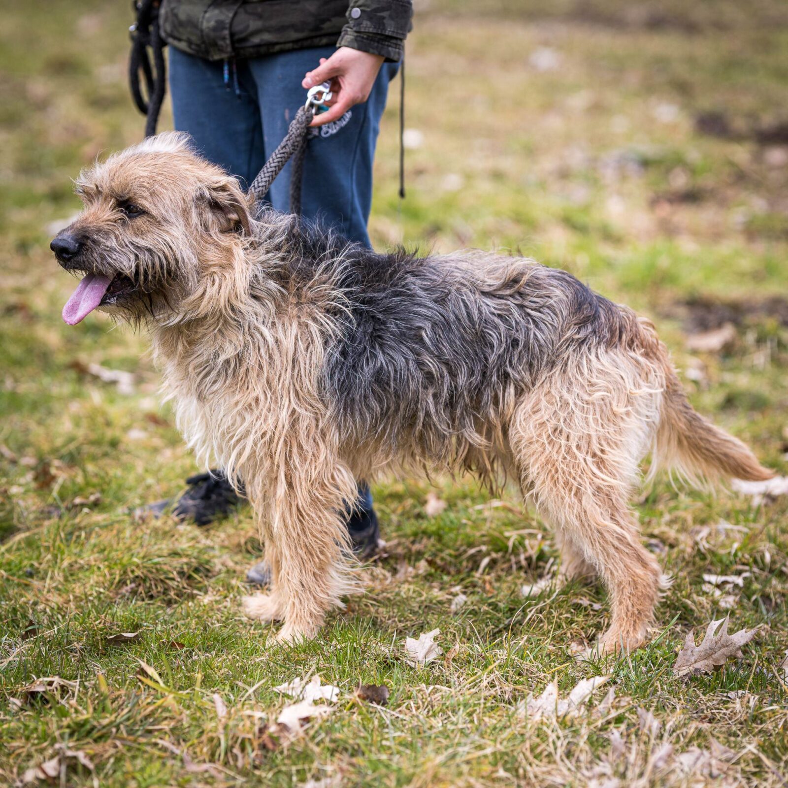 Apollo je 3 letý kříženec (zřejmě teriéra) na vyšších nohách, vážící asi 28 kg. Zpočátku nás vítal štěkotem a vrčením, protože lidem příliš nevěří, ale po pár dnech si nás oblíbil a vítá nás vrtícím ocasem. Vzhledem k tomu, že žil hlavně na zahradě a v kotci, není socializovaný s lidmi, psy atd. Na procházkách má tendence na lidi poštěkávat a ježit se, ale to plyne jen z nedůvěry a pracujeme na odbourání. Ke psům se hrne spíše se zájmem o hru. V minulé rodině byl zvyklý na děti a také na dalšího psa se kterým vycházel bez problému.