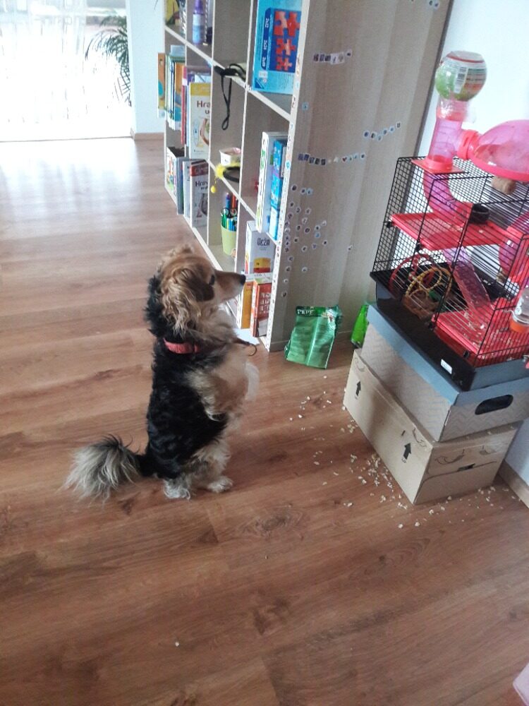 Bimbo je mladičký pejsek – do dvou let věku. Je to malý veselý čiperka, moc rád se mazlí, perfektně chodí na vodítku a je čistotný. Pochází z romské rodiny, která se odstěhovala na ubytovnu, kde zvířata mít nemohou. U Romů Bimbo běhal sám po městě v okolí do 300 m od domu, takže u něj lze očekávat určitou samostatnost, proto bude potřeba Bimba naučit základní poslušnosti. Na děti je od malička zvyklý. S ostatními pejsky se snese, ale při případném soužití s jiným psem bude zpočátku nutné usměrnit jeho žárlivost, která by mohla vést ke konfliktům. S fenami se snáší bez problémů.