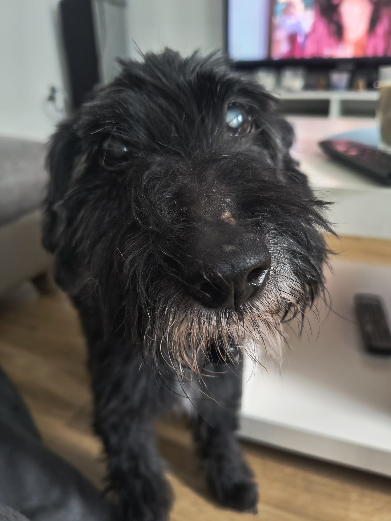 Čertisko je cca 3 letý kříženec knírače, kterému zemřela majitelka. Váží 10 kg a měří 38 cm v kohoutku, s dorůstající srstí. Čert se hodně bojí – hlavně kontaktu s novými lidmi, manipulace – zvedání, střihání, křiku atp. Nikdy však nekousne – schoulí se nebo se snaží vzdálit. S ostatními psy se snáší bez problémů. Chodí pěkně na vodítku, je mírný a klidný. Na volno v klidném prostředí chodí zcela bez problému, nikam se nevzdaluje. Mazlivý, moc hodný pes.