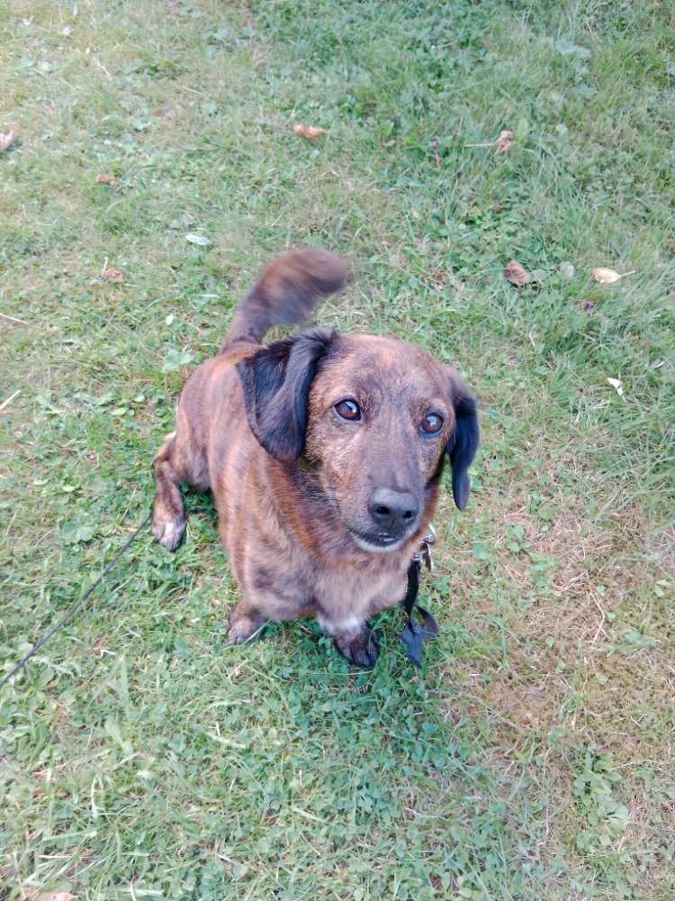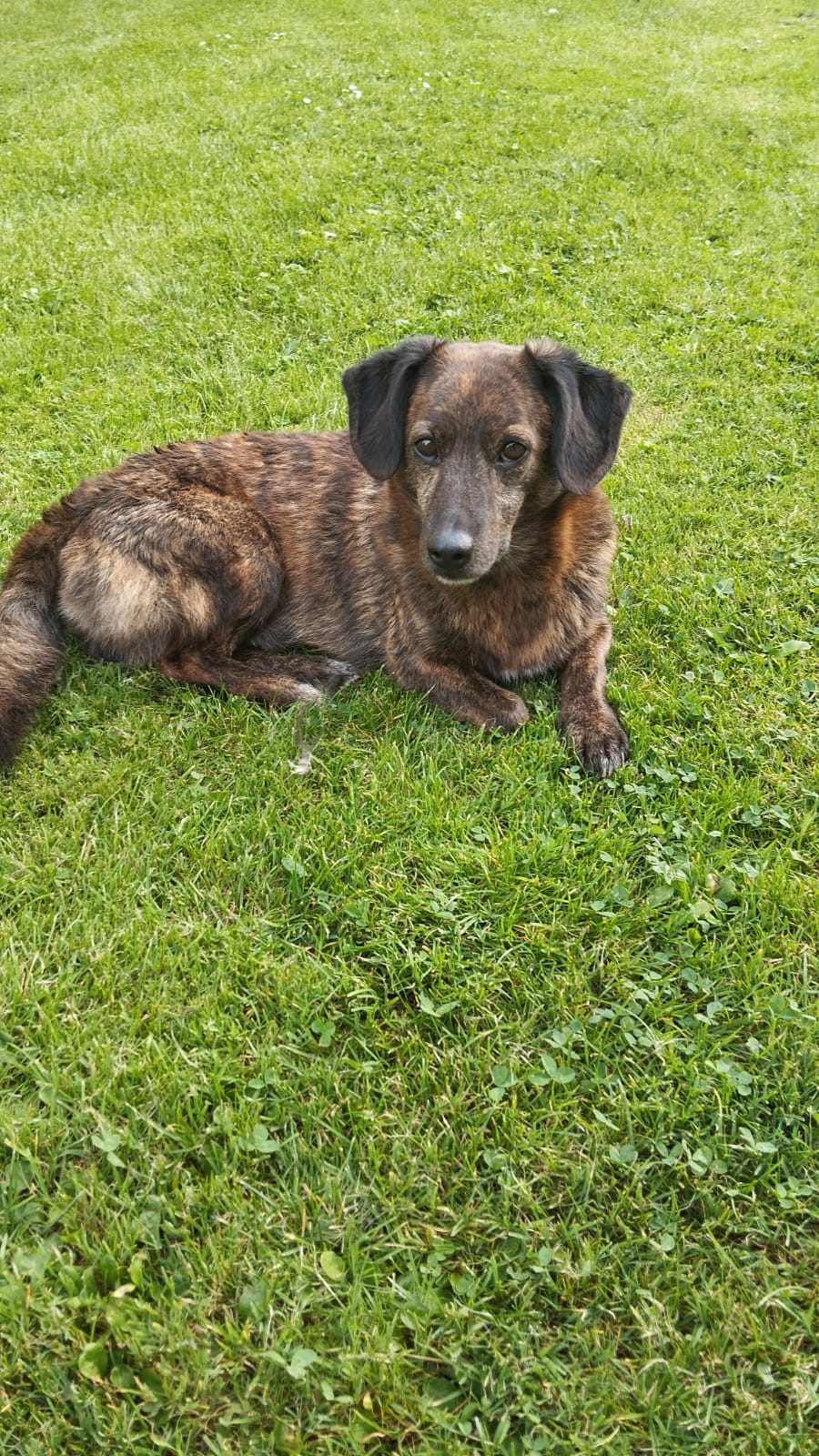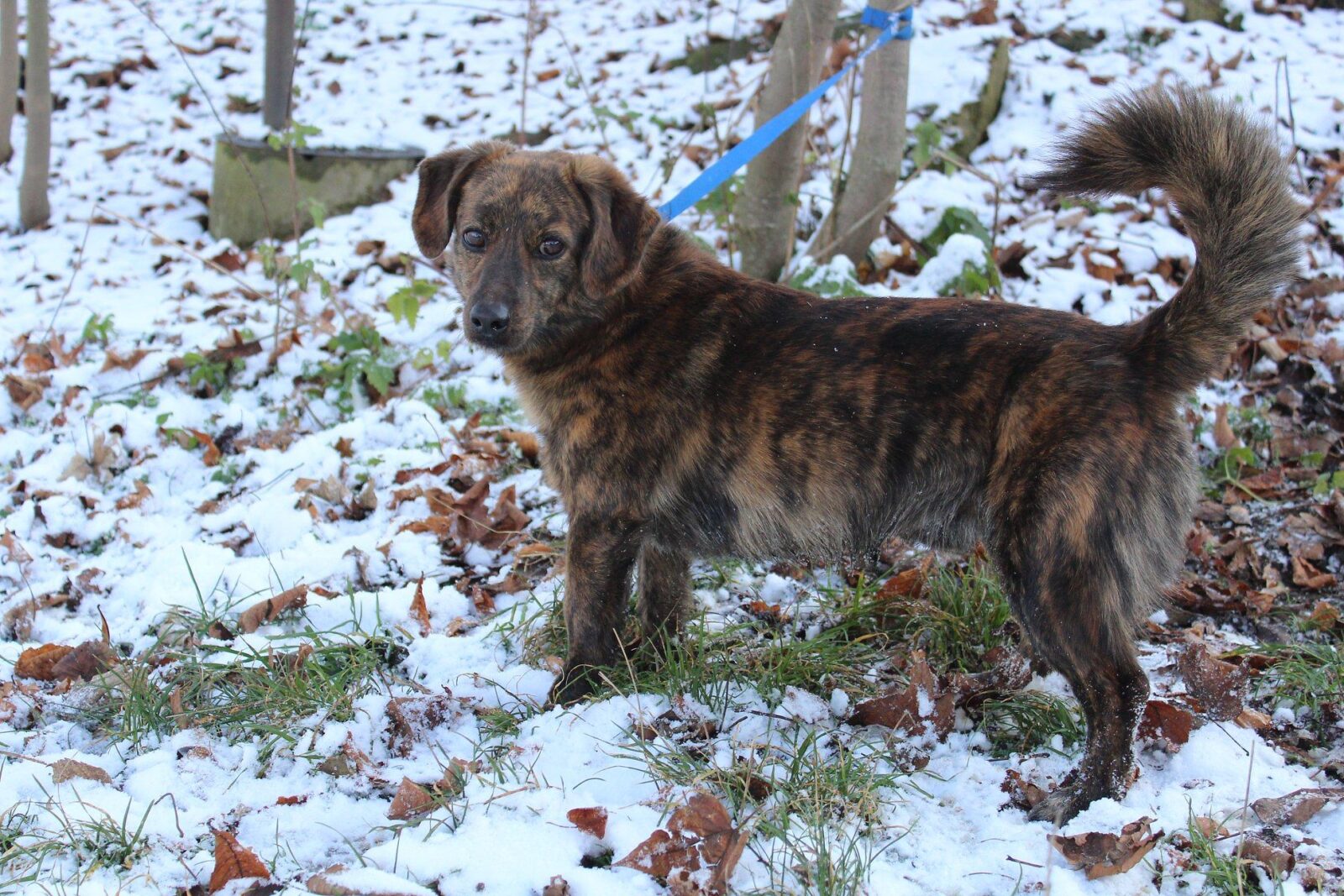 Bugsík je malý kříženec krásného žíhaného zbarvení. Váží kolem 8 kg. Věk do 3 let. Je to veselý, aktivní a přátelský pes. V některých chvílích je malinko nejistý, určitě zažil nehezké zacházení, tak je opatrný, ale to se brzy zlepší. Má rád procházky, dovádění s páníčkem a mazlení. Líbí se mu i děti, fenečky a zvládne i vyrovnaného psa pod dobrým vedením.