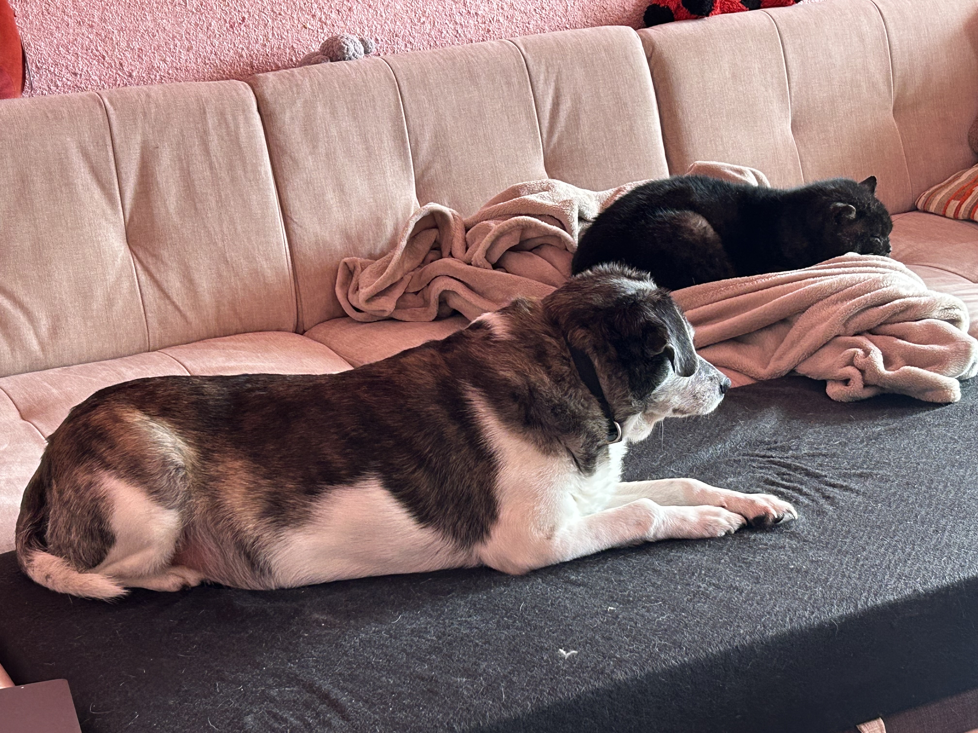 Kala našla domov v Krahulčí a je v nové rodině moc spokojená. Bydlí s dvěma kocoury kocoury. Doma se každému vetře na gauč nebo i do postele. V rodině není nikdo, komu by nedůvěřovala. Na procházku jde ale jen s paničkou.