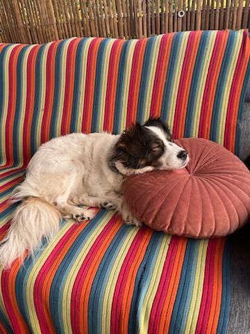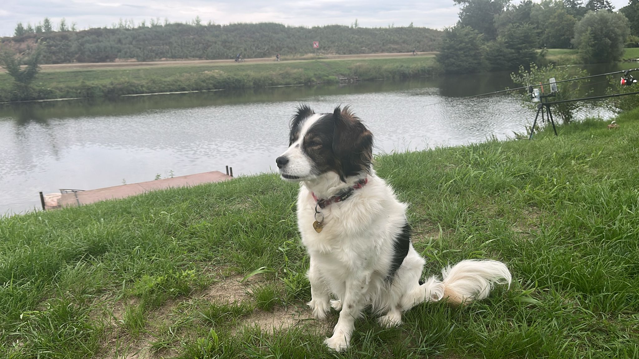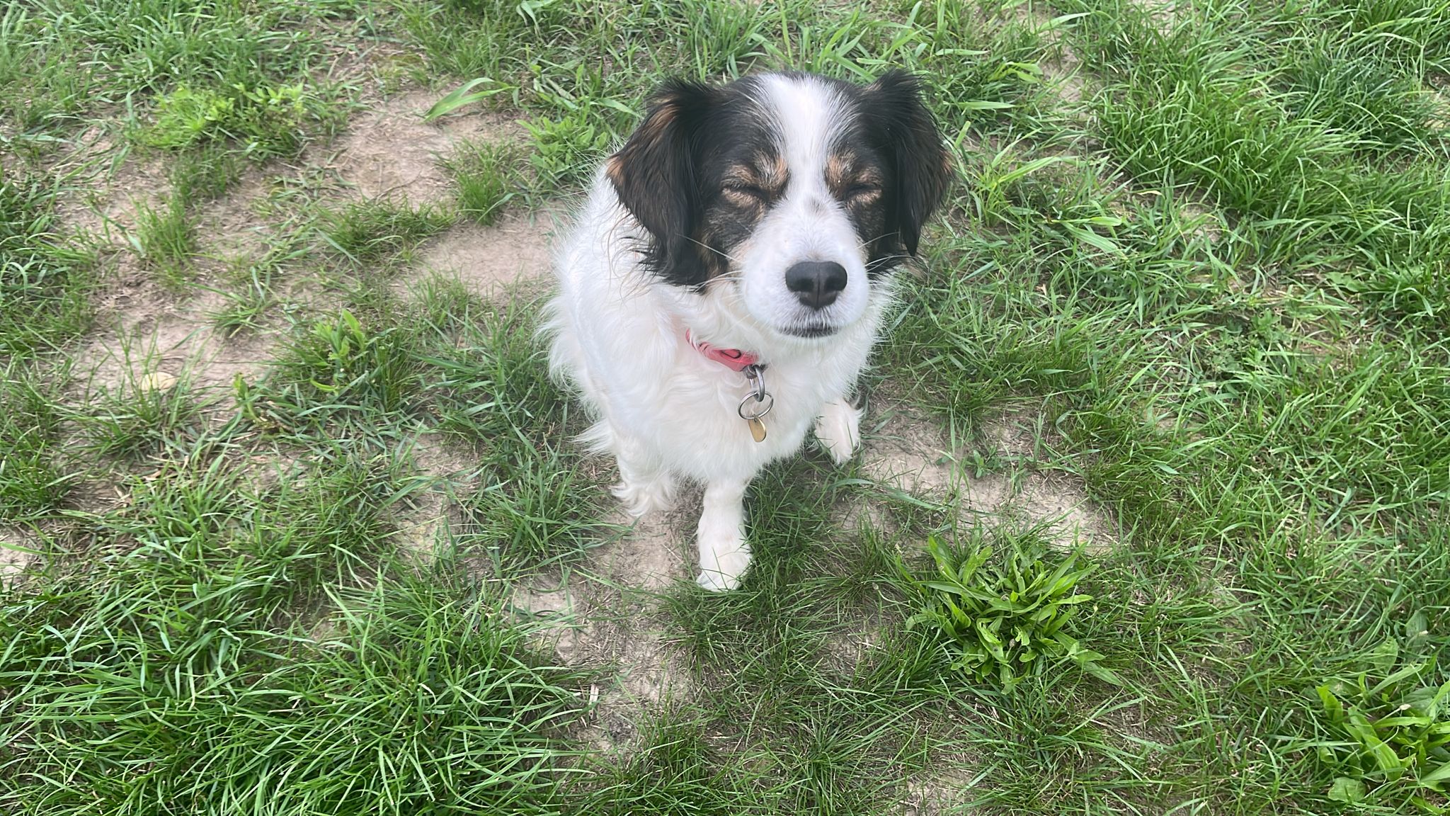 Meddie je sedmiměsíční kříženka. Váží 8 kg a měří 35 cm v kohoutku. Je naprosto bezproblémová, snášenlivá, na vodítku umí chodit i u nohy.