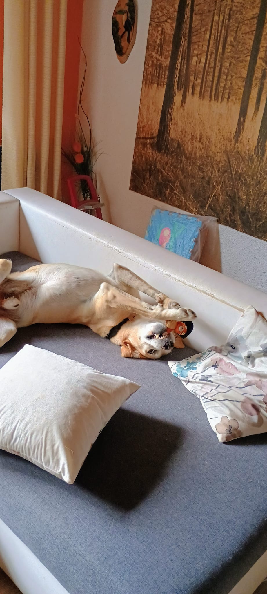 Theodor našel nový domov v Hlinsku. Má moc rád děti, zato nemá rád jiné pejsky, hezky poslouchá, rád spí v posteli a na gauči.