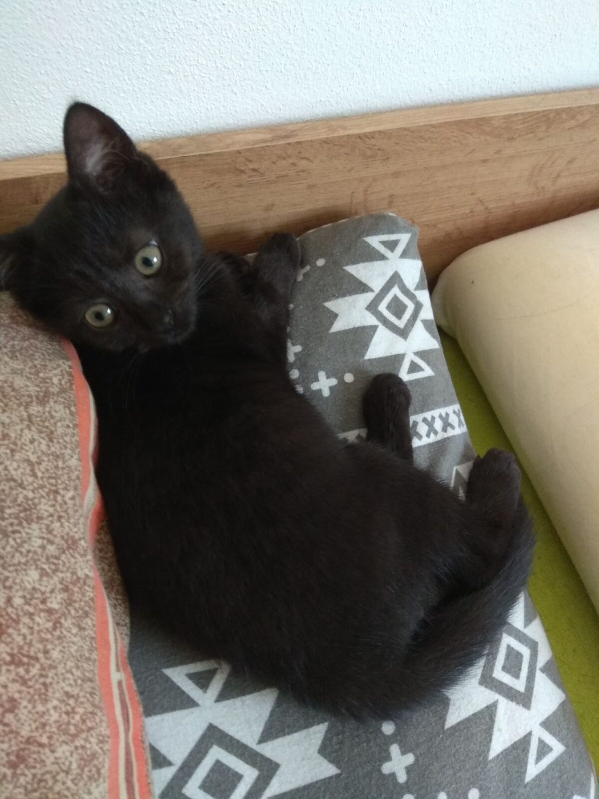 Amálie je asi 7 týdenní, velmi drobounká kočička. Byla nalezená ve 4 týdnech pod zaparkovaným autem, poblíž hlavní silnice v Pelhřimově. Byla velmi malinká a měla ošklivý zánět očí. Amálka je velká bojovnice, takže se se vším poprala a krásně roste. Bezmezně miluje kontakt s člověkem, hodiny drbání na bříšku, kde vám spokojeně vrní a pak usne. Ráda si hraje s dalšími kočičkami a ničeho se nebojí. Amálka hledá domov pouze uvnitř bez přístupu ven.