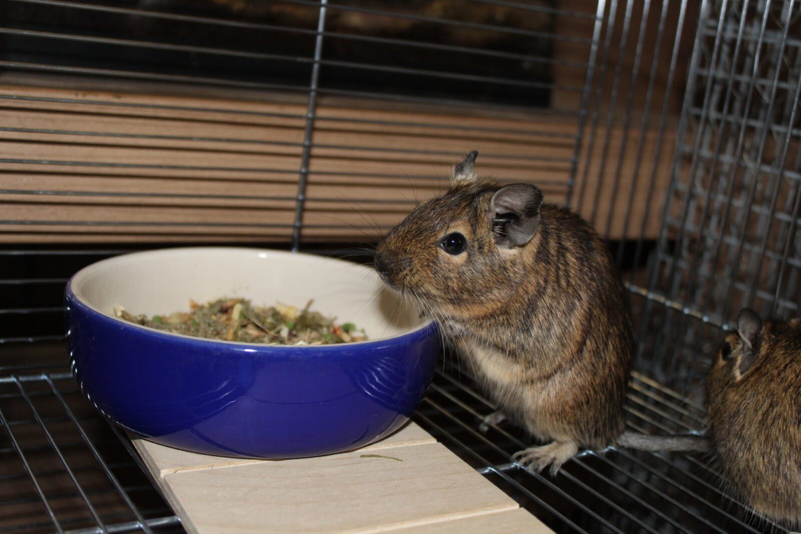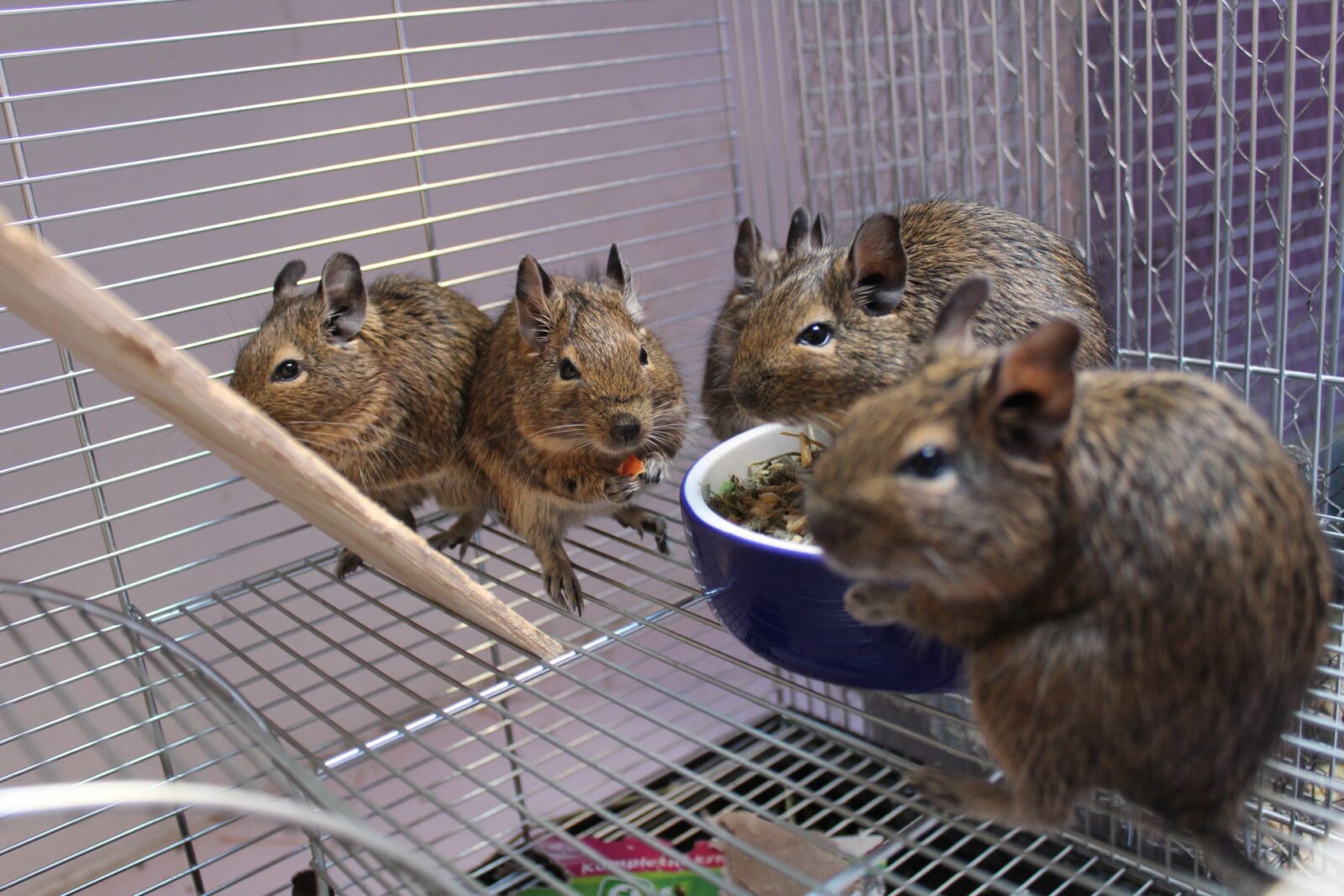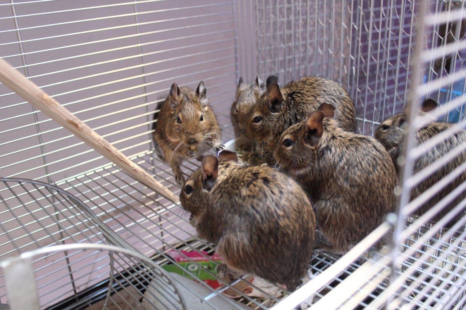 Tito osmáci degu zůstali osamoceni v bytě, o jehož vystěhování rozhodlo město Pelhřimov. Ve dvou chatrných klecích bylo přes dvacet osmáků, bohužel nerozdělených podle pohlaví, po bytě jich běhalo několik dalších. Celkem jich bylo 25, ovšem většina samiček byla březích a již se narodilo několik vrhů mláďat. Všichni osmáčci hledají nové domovy. Ideálně po dvou stejného pohlaví nebo k již sžité skupině stejného pohlaví. Někteří jsou plašší, ale žádní nekoušou. Jsou nenároční, krmíme je senem, trávou, zeleninou, směsí pro osmáky nebo činčily. Rádi běhají v kolečku a je velká legrace je pozorovat.
