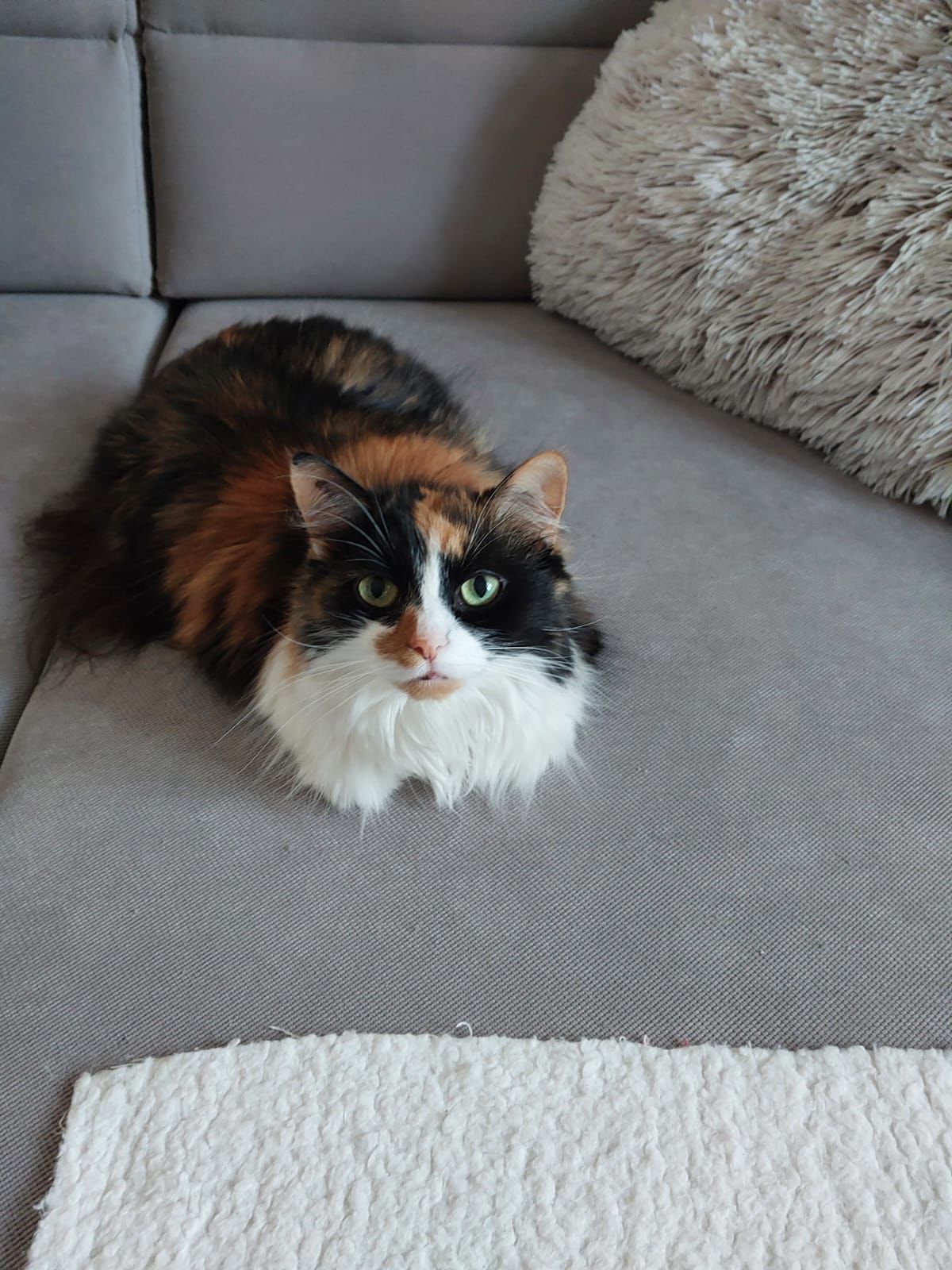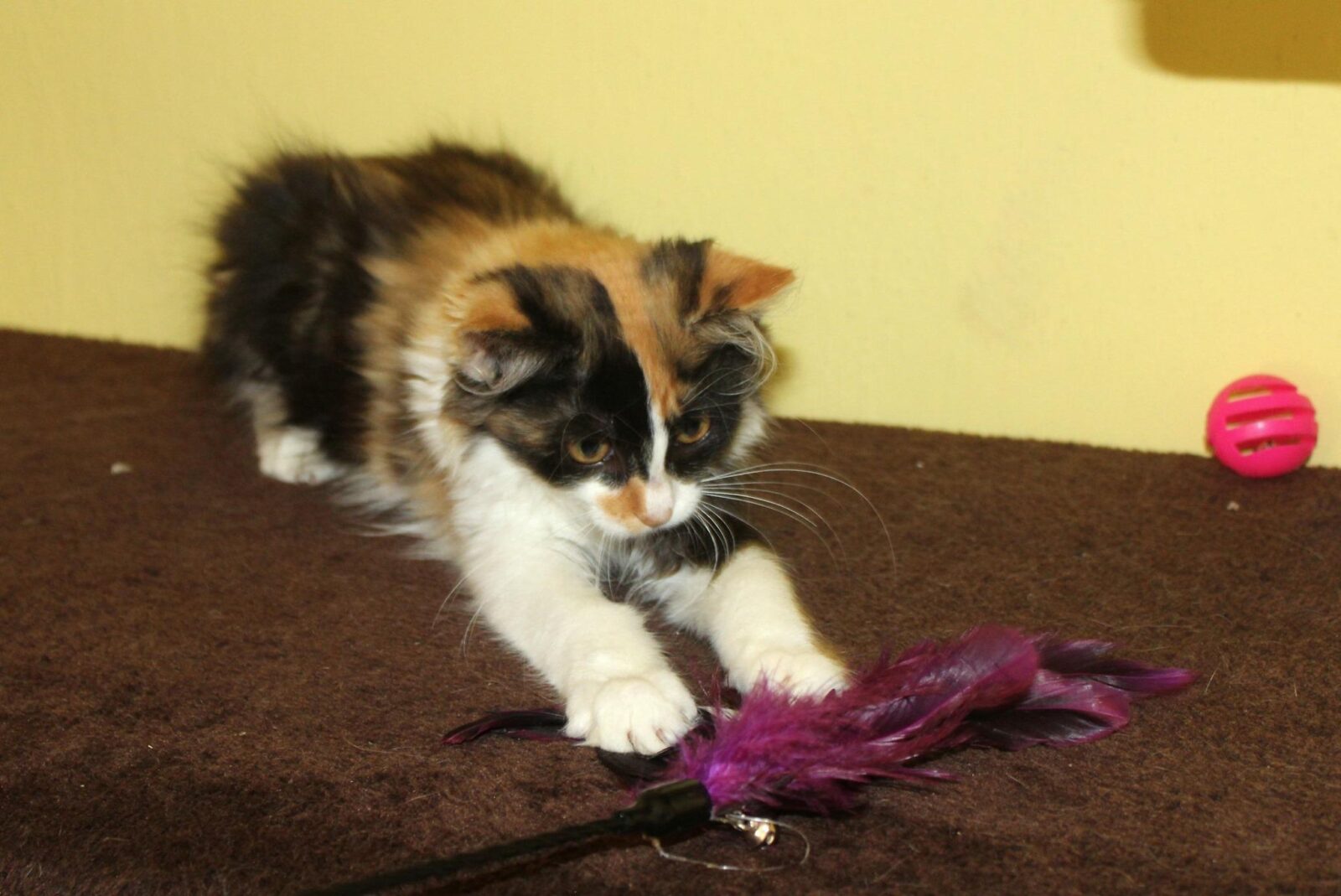 Rozinka je asi 2,5 měsíční, barevná kočička. Zpočátku je plašší, potřebuje si zvyknout na nové lidi a prostředí. S trpělivým přístupem z ní brzy bude sebevědomá kočička. Byla odchycena se svým sourozencem a maminkou v Pelhřimově v zahr. kolonii, poblíž lokality Polní Dvůr, dne 8. 8. 2019. Podmínkou adopce je kastrace v dospělosti. Vhodná pouze do bytových podmínek.