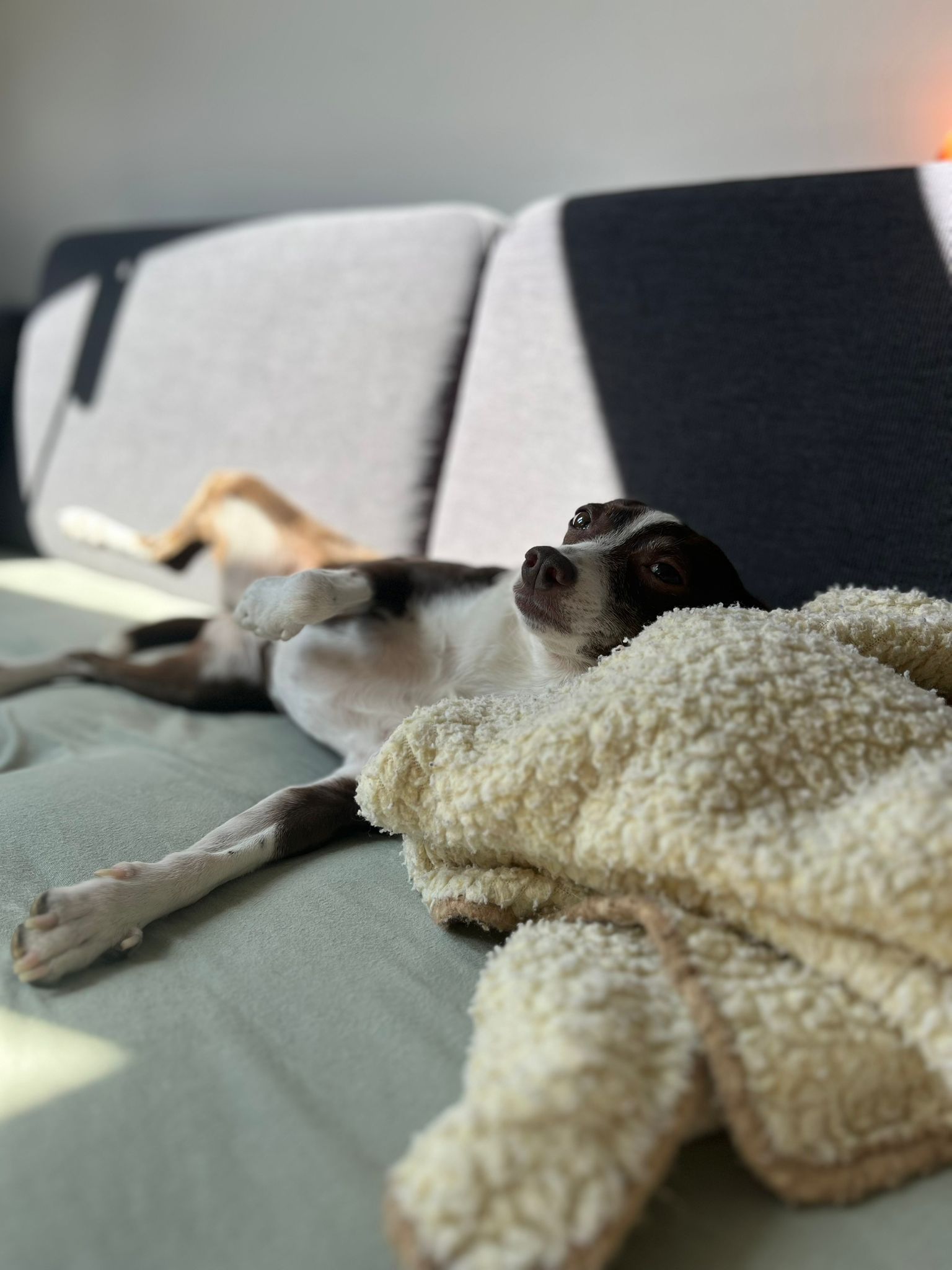 Jumika našla skvělý domov v mladé rodině na okraji Prahy a žije s mladou fenkou Italského chrtíka se kterou si skvěle sedla.
