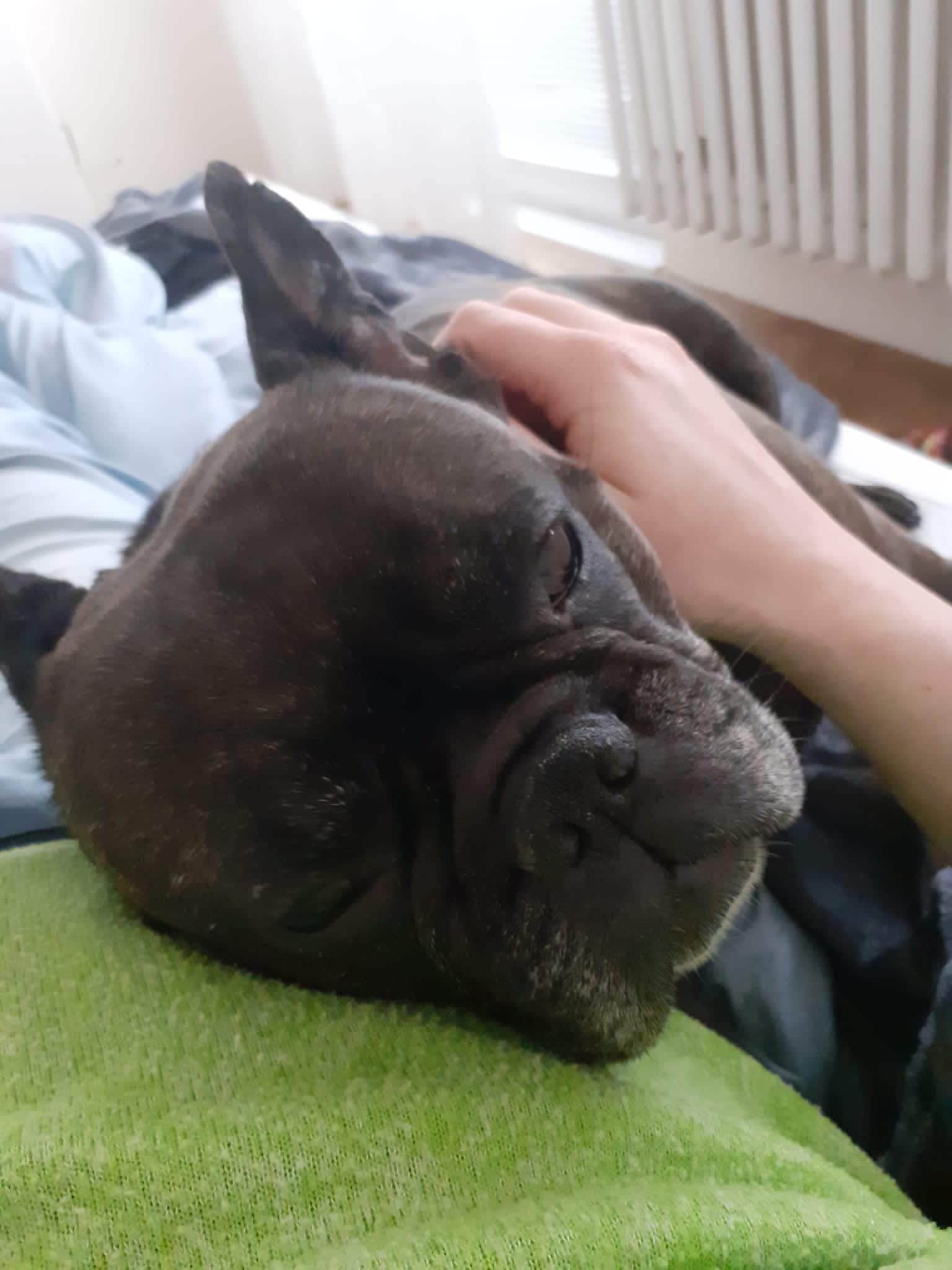 Amber je pětiletá kastrovaná kříženka francouzského buldočka. Váží 11 kg a měří 30 cm v kohoutku. Amber je chytrá, zvídavá, ale klidná fenečka. Amber má ráda spíše dospěláky, na děti, které naruší její klid nebo prostor, může reagovat negativně. Její nejoblíbenější hra je kousání dřeva nebo uzlu, ráda se přetahuje. Neničí vybavení domácnosti. Amber je aktivní, ocení každou procházku, chodí dobře na vodítku, ale může chodit i na volno. S kolemjdoucími psy se míjí bez problémů, v lese neloví. Je schopna soužití s kočičkou a při dobrém vedení také s jinými psy. Amber je zvyklá v bytě, ale není ráda sama, obtížně zvládá odloučení od pána.