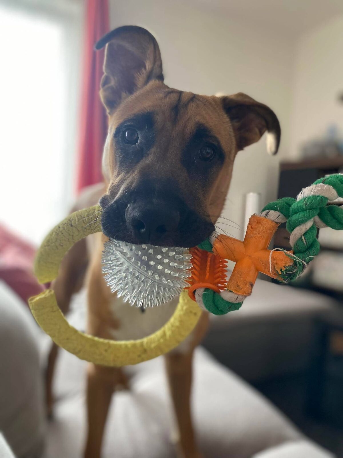 Dingo je jedno ze štěňátek fenky Dolly, která u nás 12. 9. 2021 porodila 6 krásných štěňátek (3 fenky a 3 pejsky – matka kříženka německého ovčáka a amerického stafordširského teriéra, otec americký stafordširský teriér). Dingo je moc hodný pejsek, který si rád pospí. Když je ale vzhůru, nepohrdne zábavou a rád se zapojí do každé hry. K odběru v polovině listopadu.