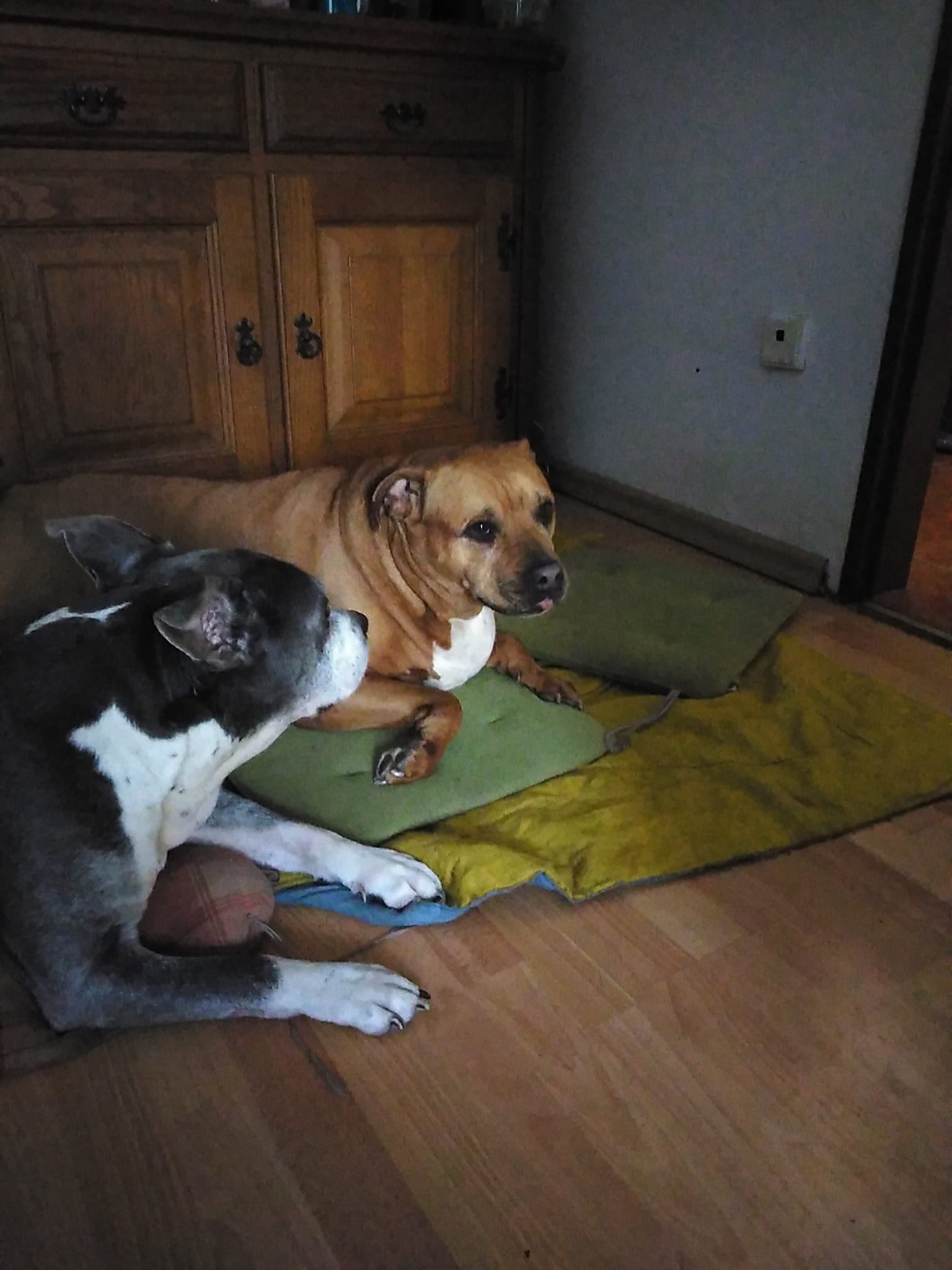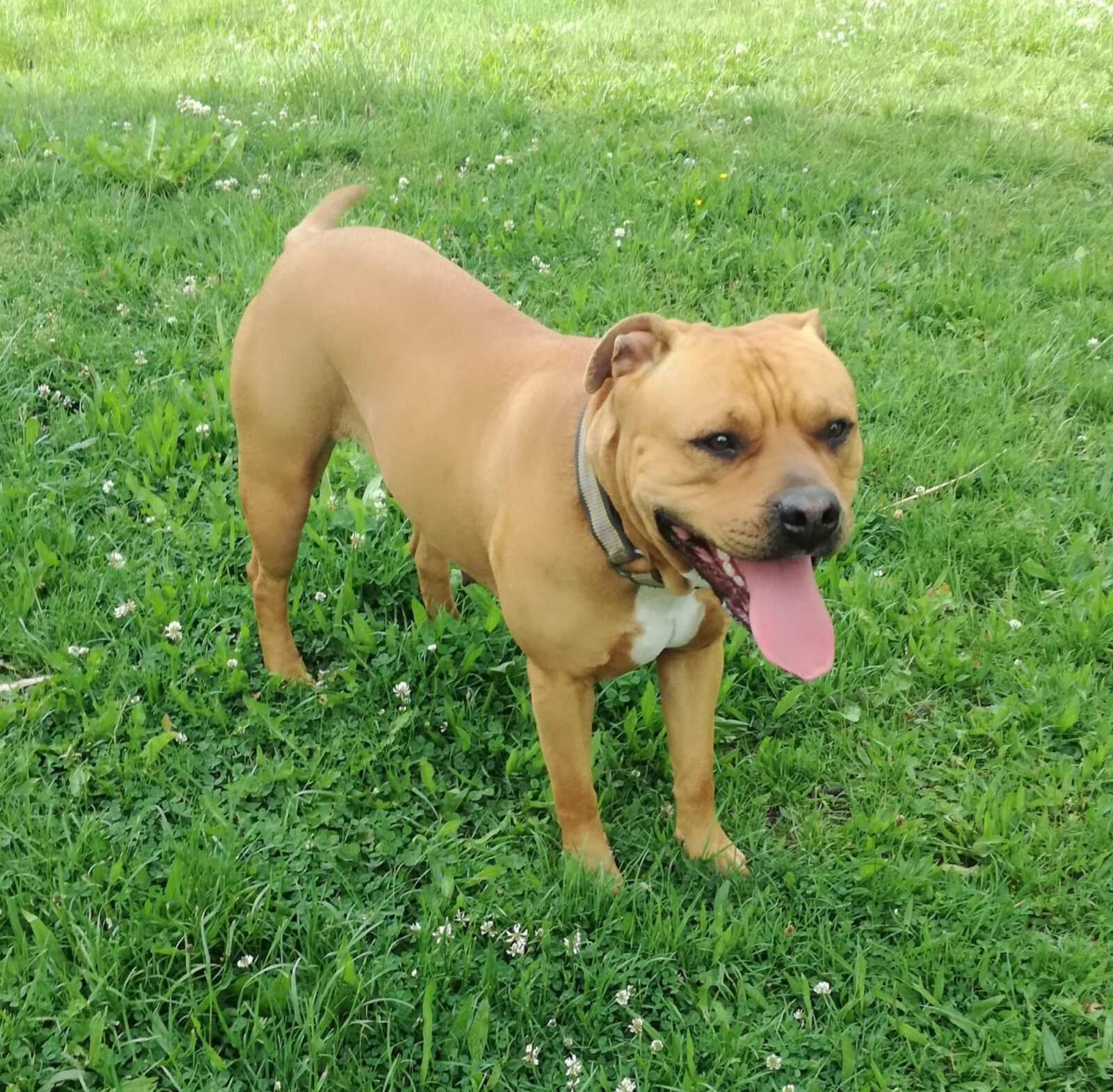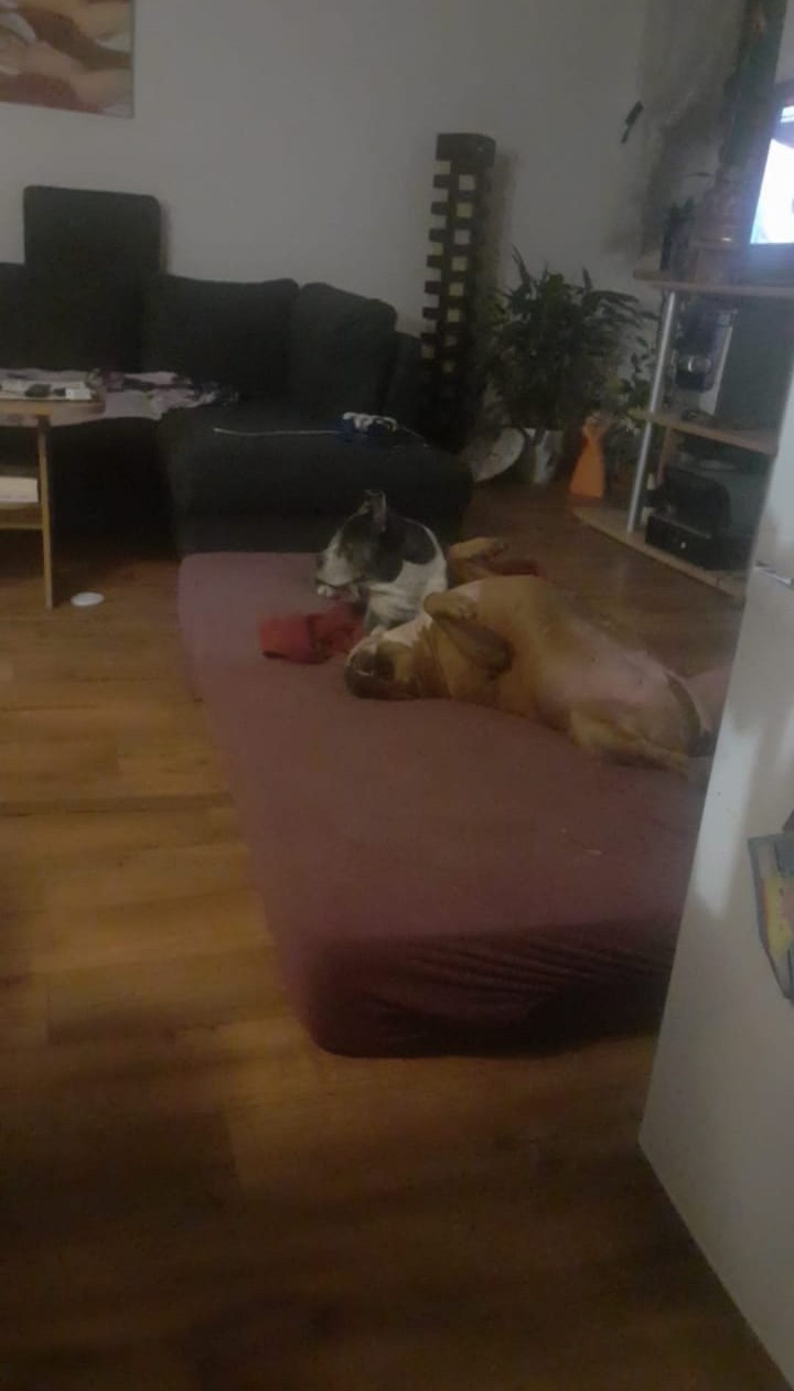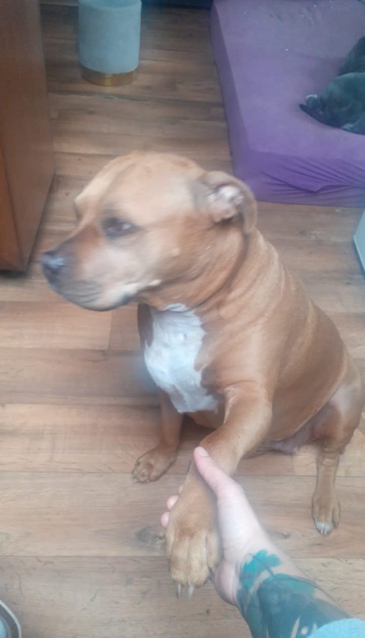 Sophia je 5 letá kříženka staforda. Váží 37 kg a měří 46 cm v kohoutku. Sofinka miluje lidi a obzvlášť děti. Byla zvyklá spát přitulená k člověčímu miminku. Je to mladá, aktivní psí holka, zvyklá v bytě a na dlouhé procházky nebo proběhnutí s pánem. Má ráda domácí kočičky, dokonce je ochraňuje, bez problémů je soužití s drobnými domácími mazlíčky jako morče atd. Sofí má bohužel velký problém s fenkami, začala velmi agresivně napadat spolužijící fenku a proto ji majitelé odložili k nám. Psy si vybírá, většinou problém nemá.