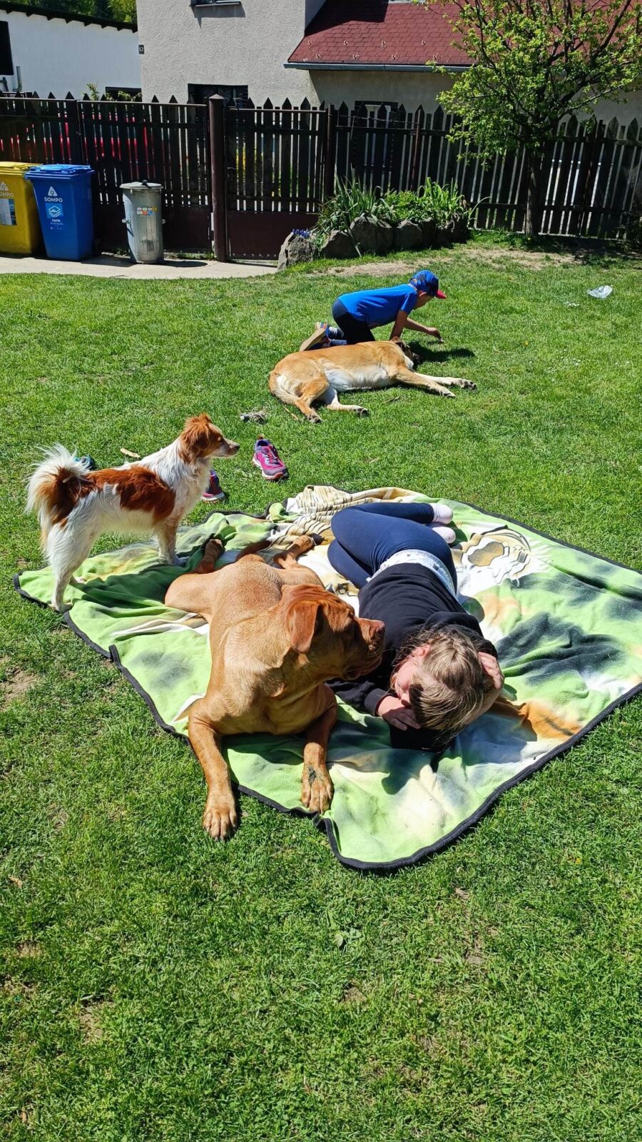 Amos našel nový domov ve Vilémově, kde žije v domečku s dalšími psími kamarády a samozřejmě i s prima páníčky.