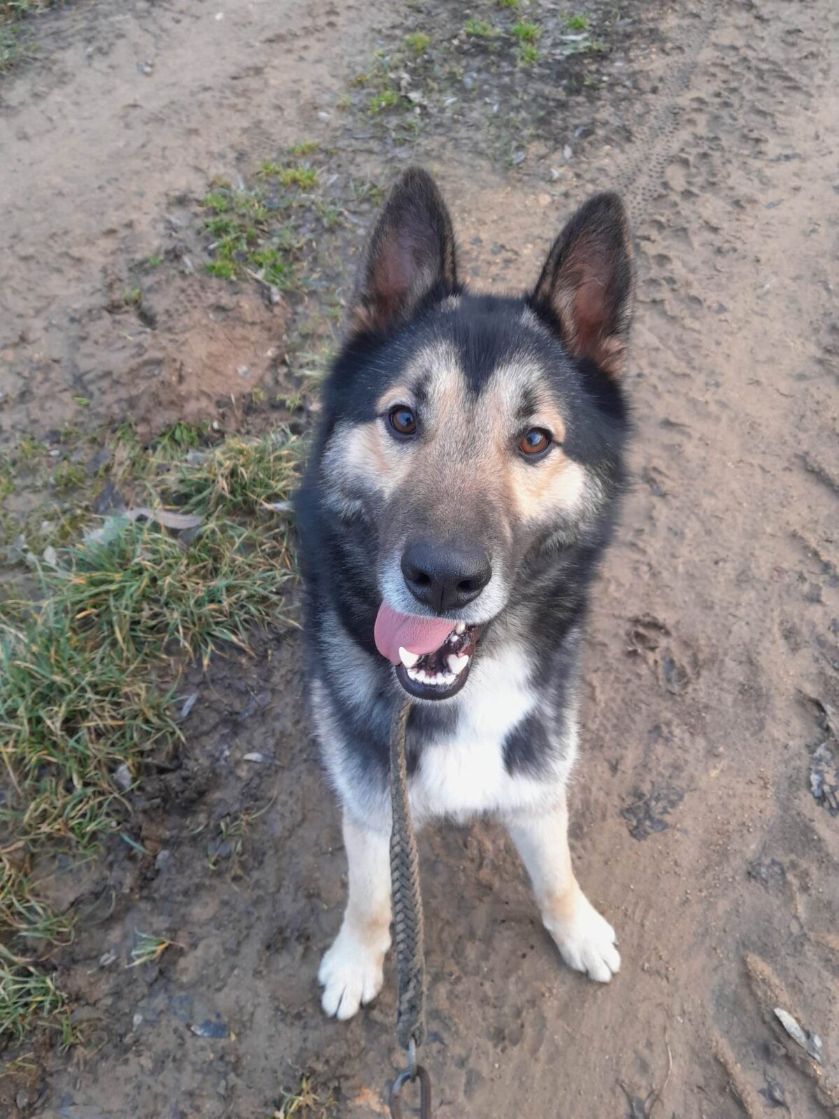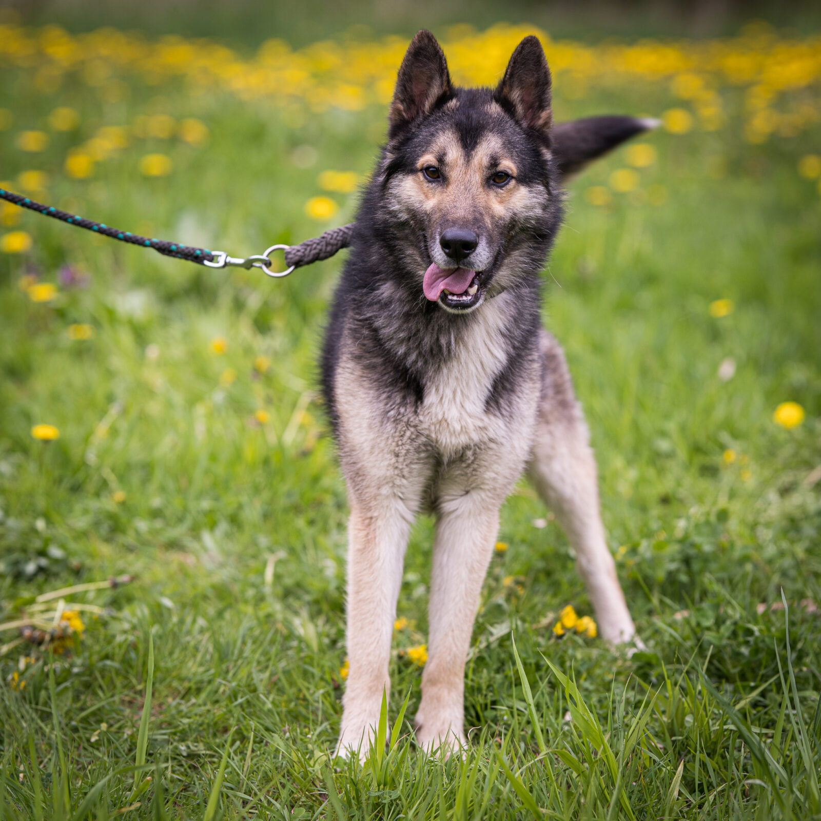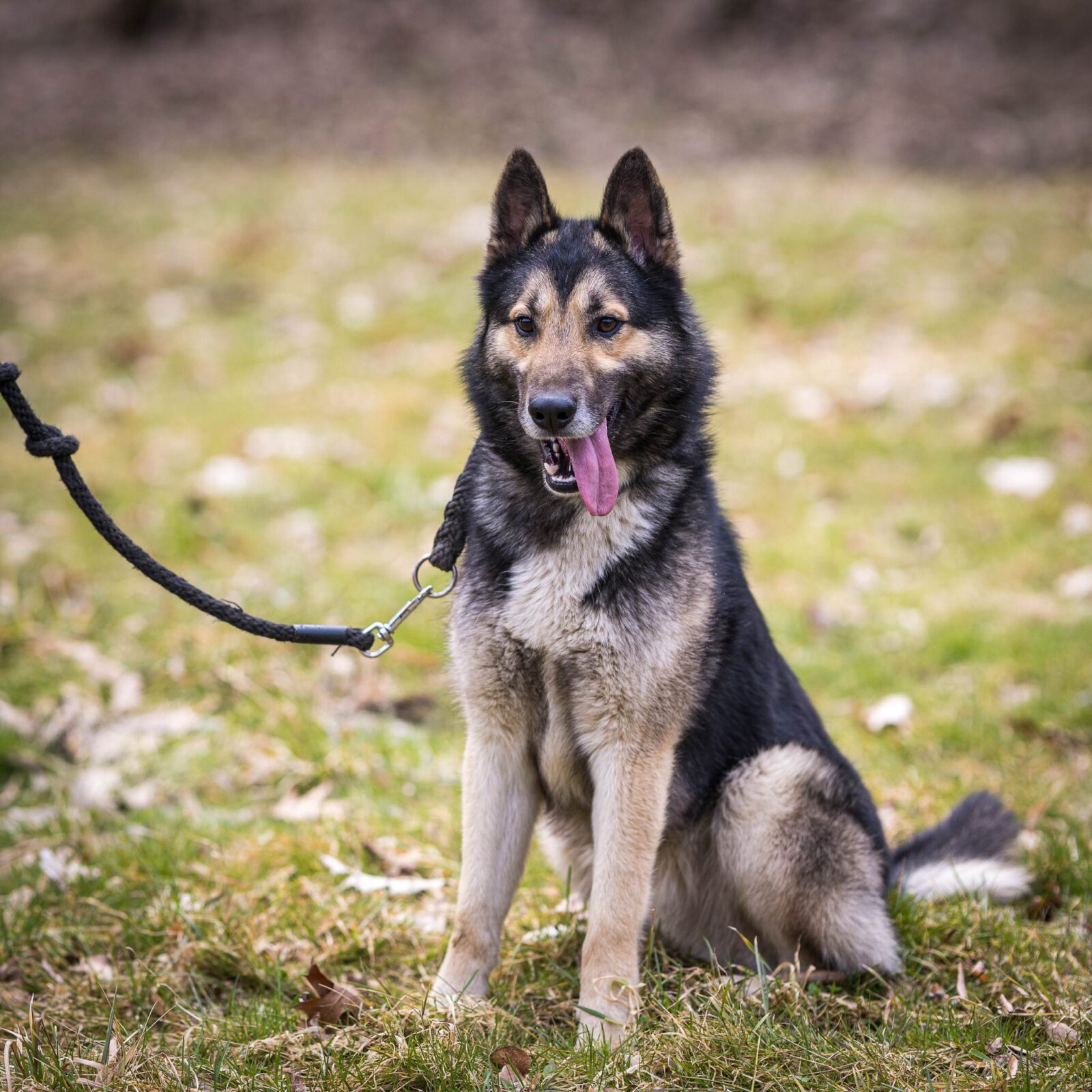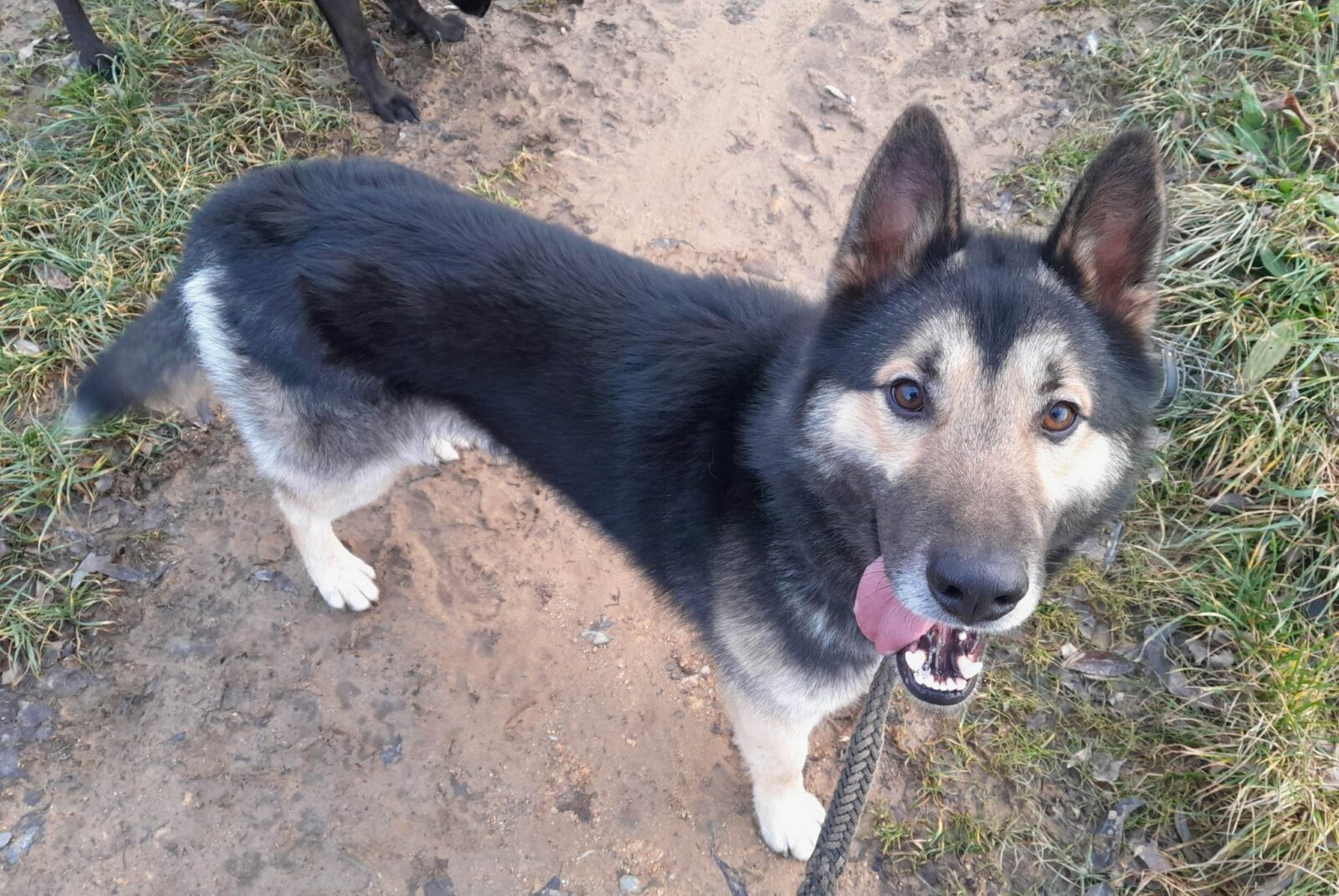 Grimm je 1,5 letý kříženec pravděpodobně kolie a huskyho, váží 20 kg. Grimmík je aktivní pes, dokonalý parťák pro aktivnějšího člověka. U nás se velmi rychle projevil jako hodný, vítací a veselý pejsek, který rozdává úsměvy na všechny strany. Zpočátku je trochu lekavý a bojí se prudších pohybů, ale jen co ale zjistí, že mu nic špatného nehrozí, strach pomine. Na procházkách je Grimm nejšťastnější, nejraději by chodil hodiny a hodiny. Zajímají ho na nich kolemjdoucí i cyklisti, s každým by se šel seznámit. K jiným psům se snaží tahat, ale i to se lepší. Co se snášenlivosti týče, s fenami je bezproblémový, u psů určitě potřebuje delší čas na seznámení. Grimm k sobě hledá někoho, kdo s ním bude aktivně žít a bude počítat s tím, že ho v předešlém domově prakticky nic nenaučili, socializaci i výchovu už dohání u nás, stačí jen navázat na naši práci, Grimm ochotně spolupracuje.