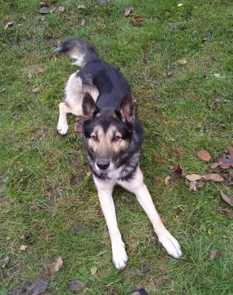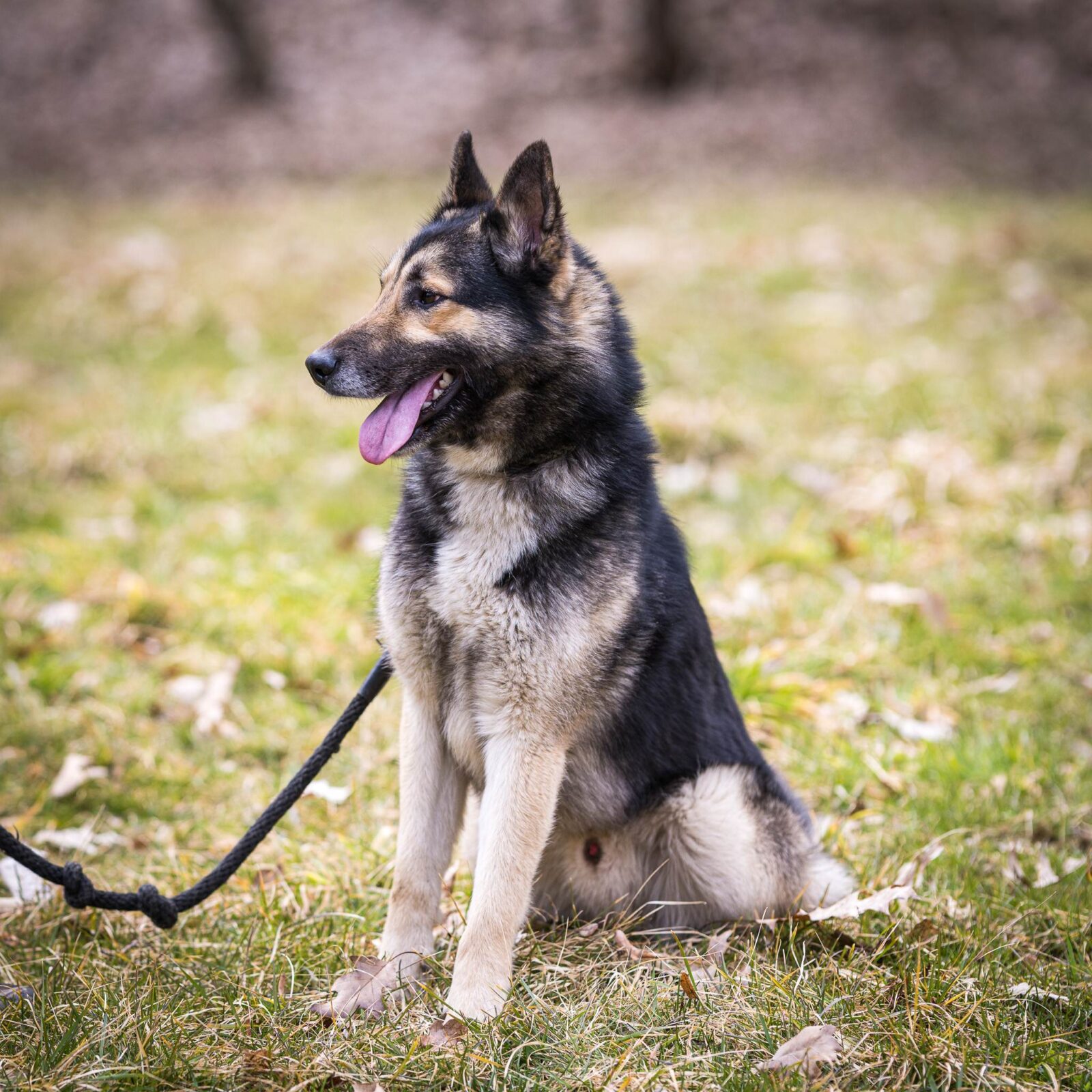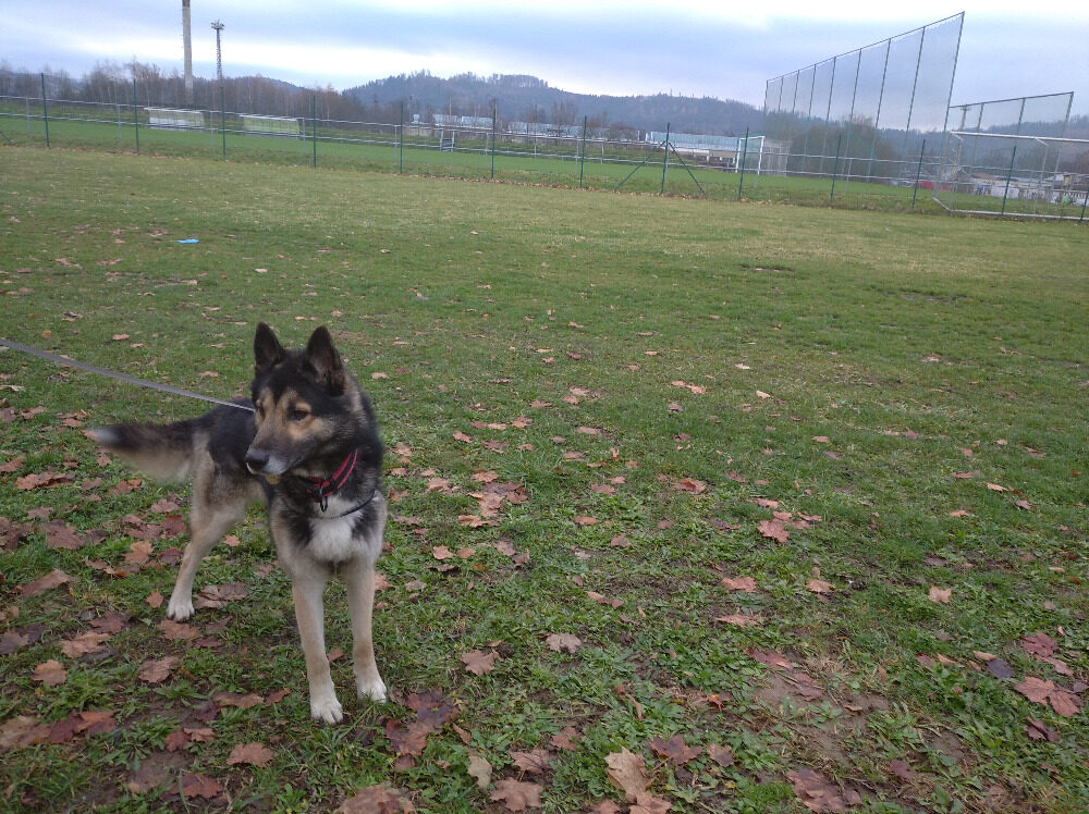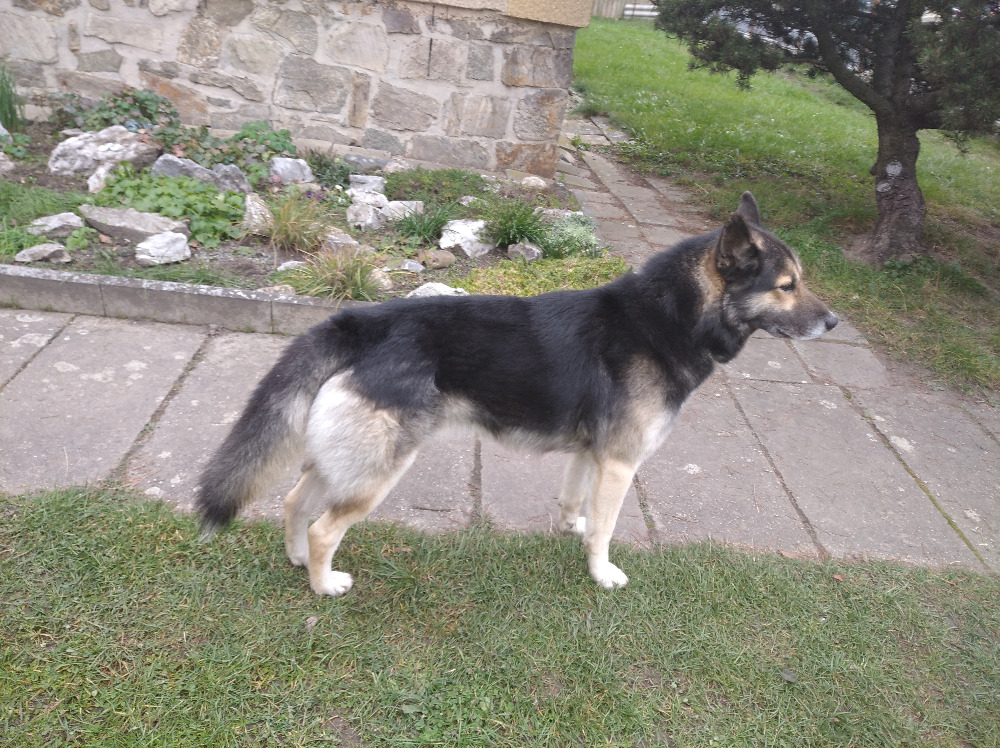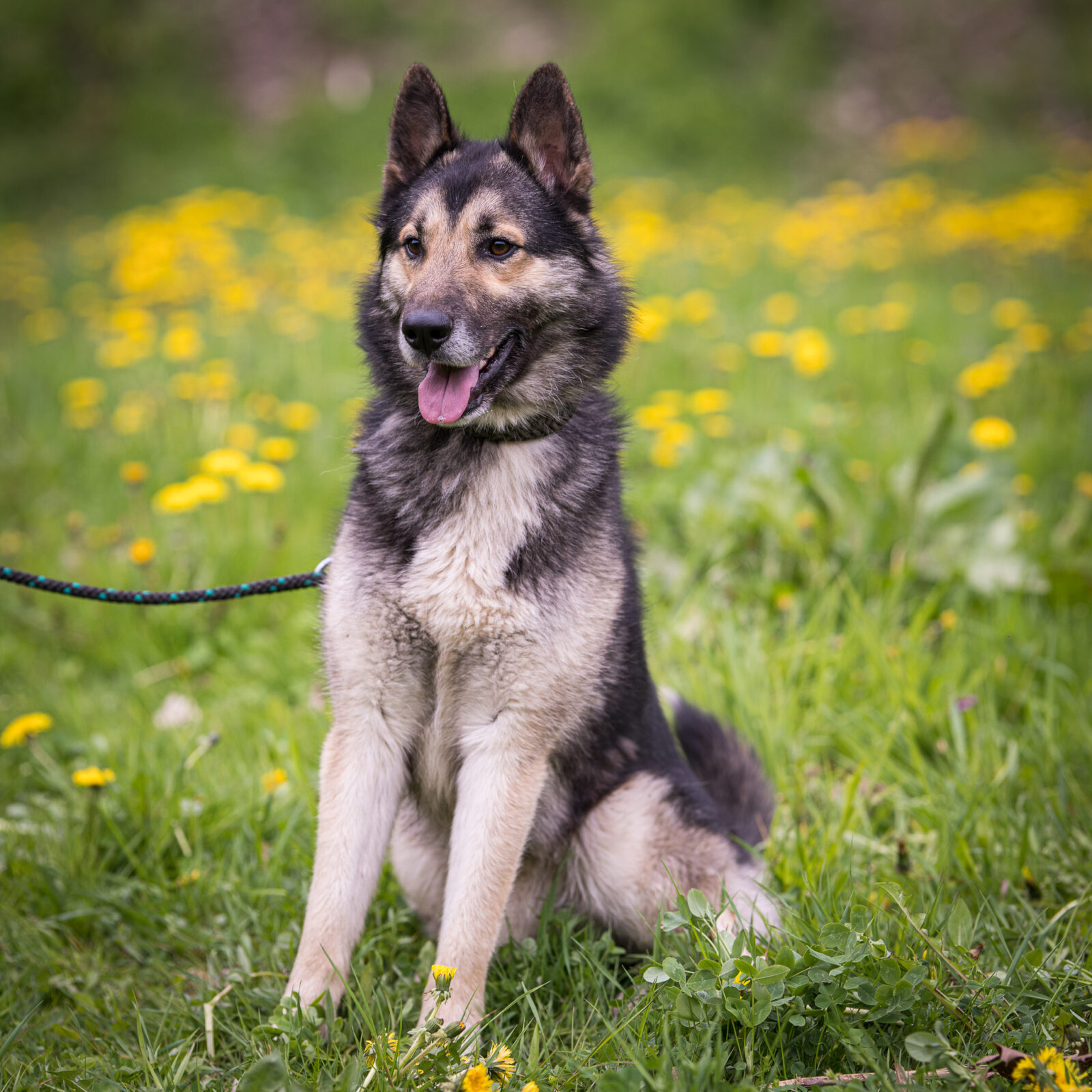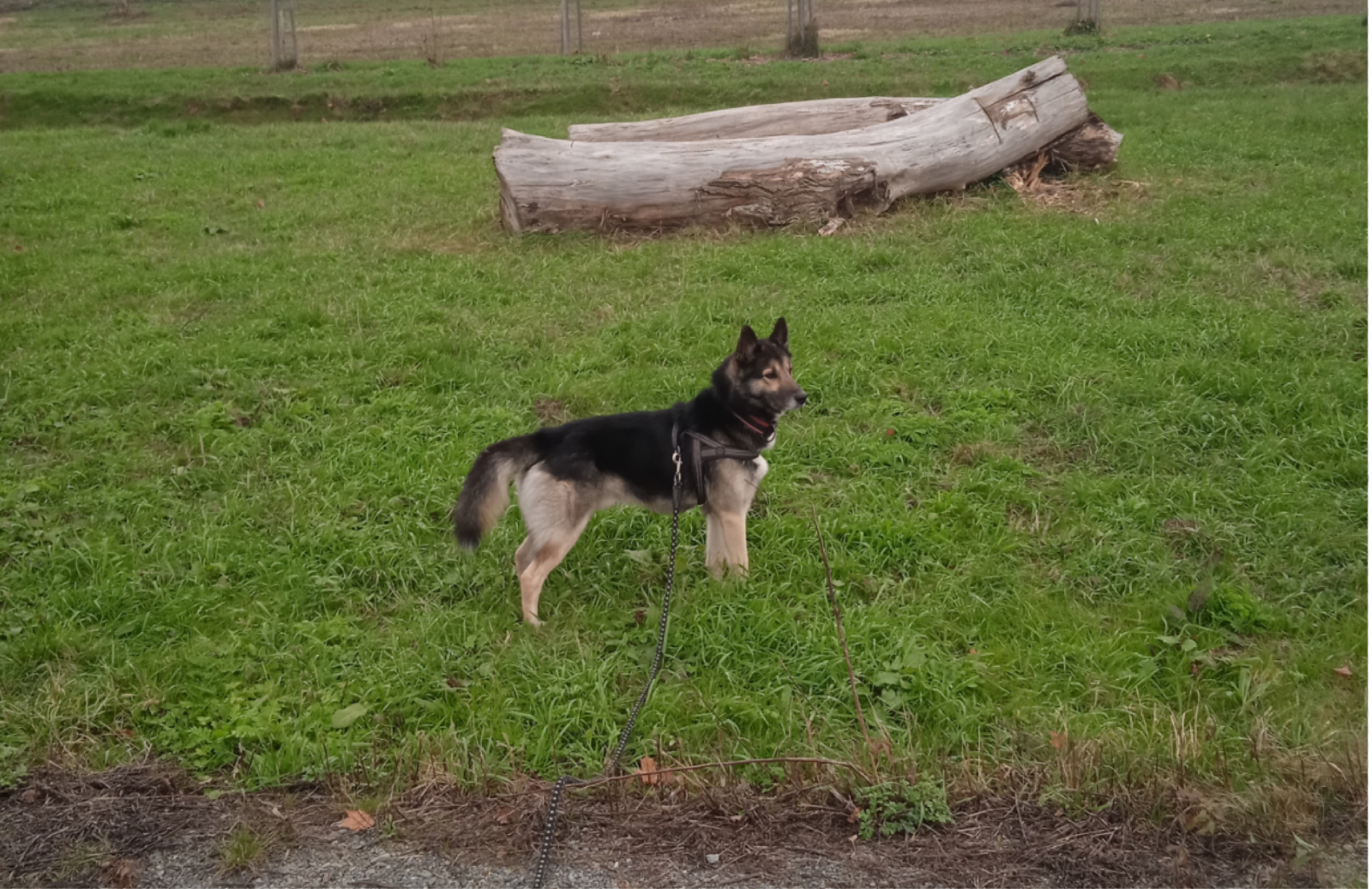 Grimm je 1,5 letý kříženec pravděpodobně kolie a huskyho, váží 20 kg. Grimmík je aktivní pes, dokonalý parťák pro aktivnějšího člověka. U nás se velmi rychle projevil jako hodný, vítací a veselý pejsek, který rozdává úsměvy na všechny strany. Zpočátku je trochu lekavý a bojí se prudších pohybů, ale jen co ale zjistí, že mu nic špatného nehrozí, strach pomine. Na procházkách je Grimm nejšťastnější, nejraději by chodil hodiny a hodiny. Zajímají ho na nich kolemjdoucí i cyklisti, s každým by se šel seznámit. K jiným psům se snaží tahat, ale i to se lepší. Co se snášenlivosti týče, s fenami je bezproblémový, u psů určitě potřebuje delší čas na seznámení. Grimm k sobě hledá někoho, kdo s ním bude aktivně žít a bude počítat s tím, že ho v předešlém domově prakticky nic nenaučili, socializaci i výchovu už dohání u nás, stačí jen navázat na naši práci, Grimm ochotně spolupracuje.