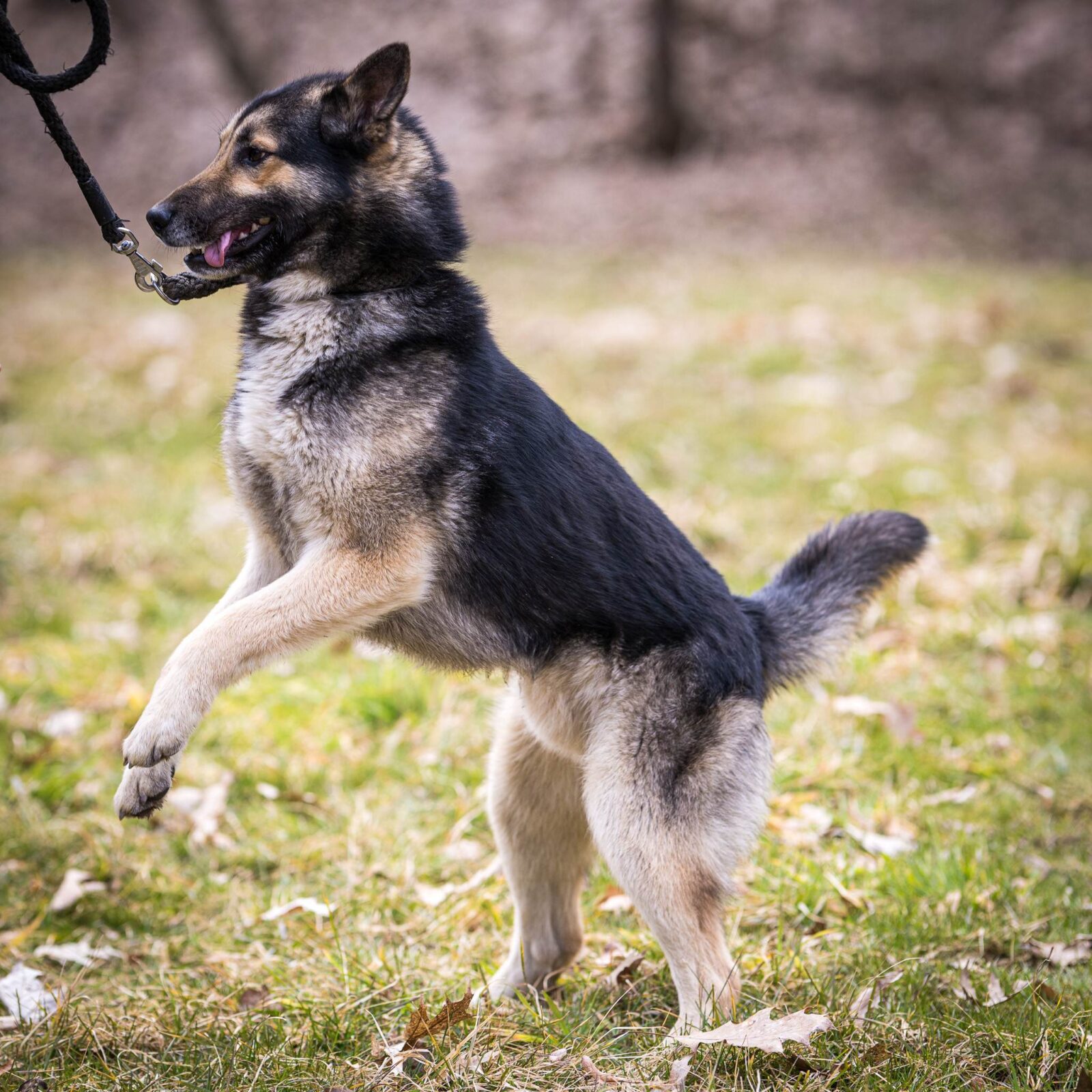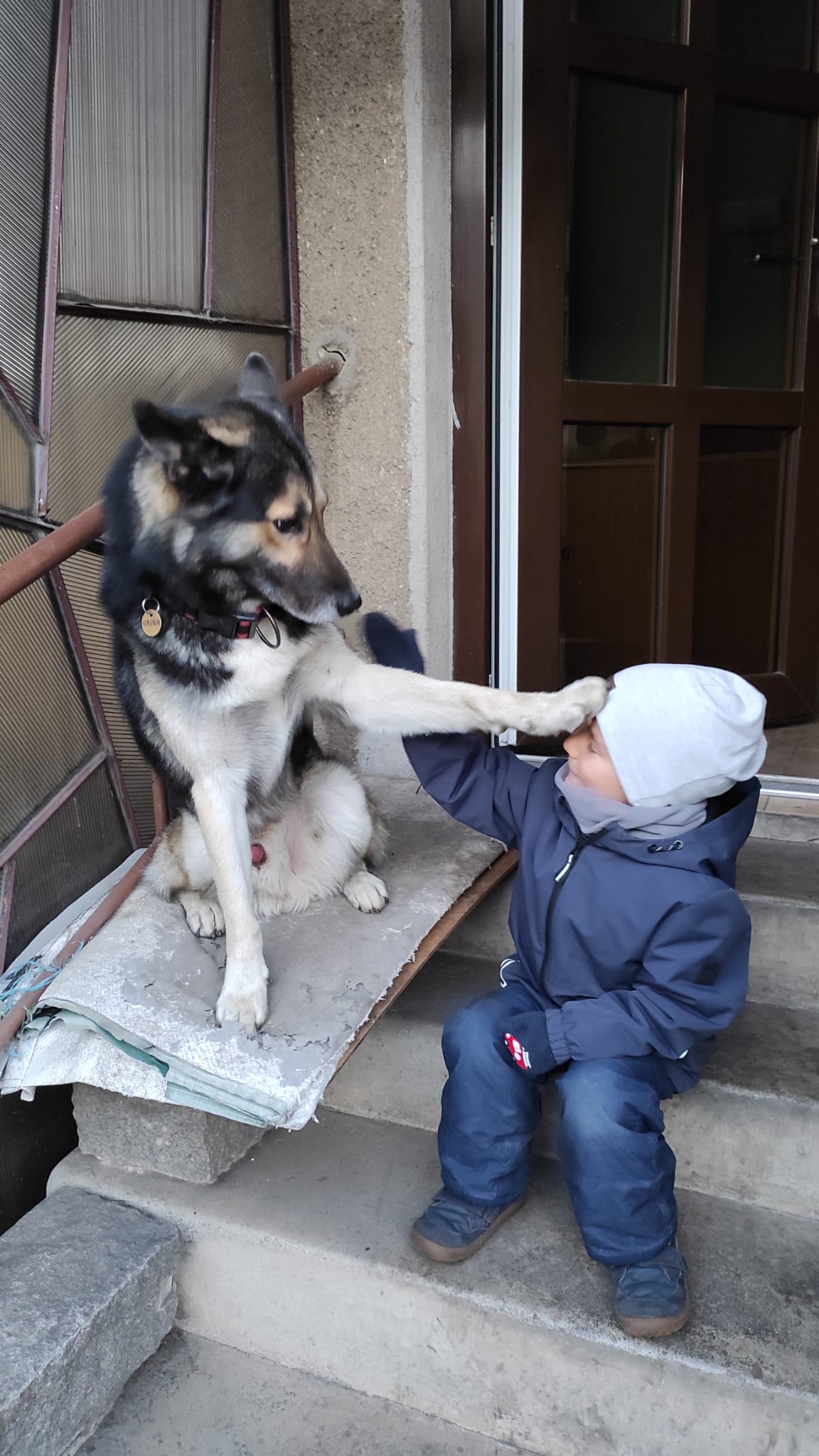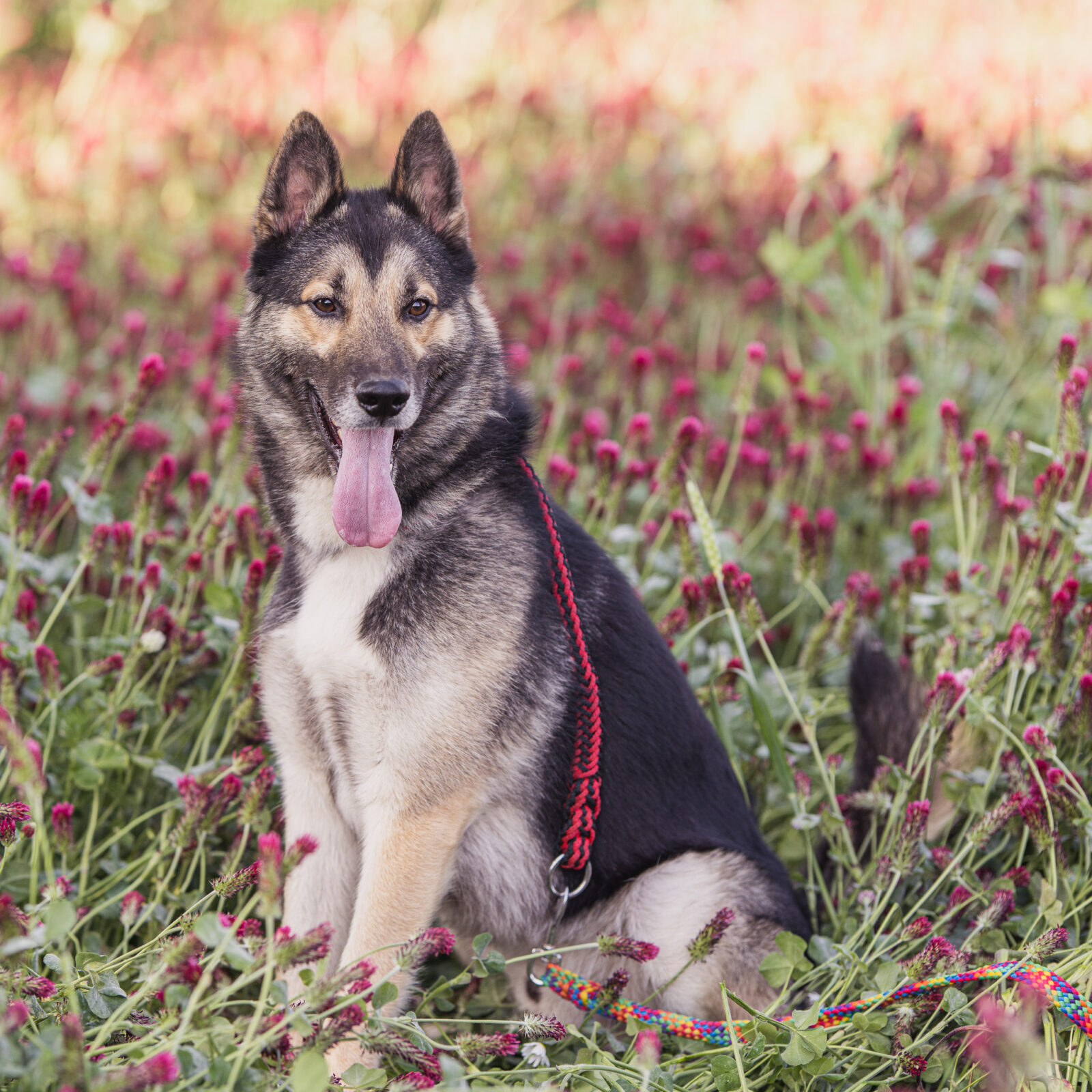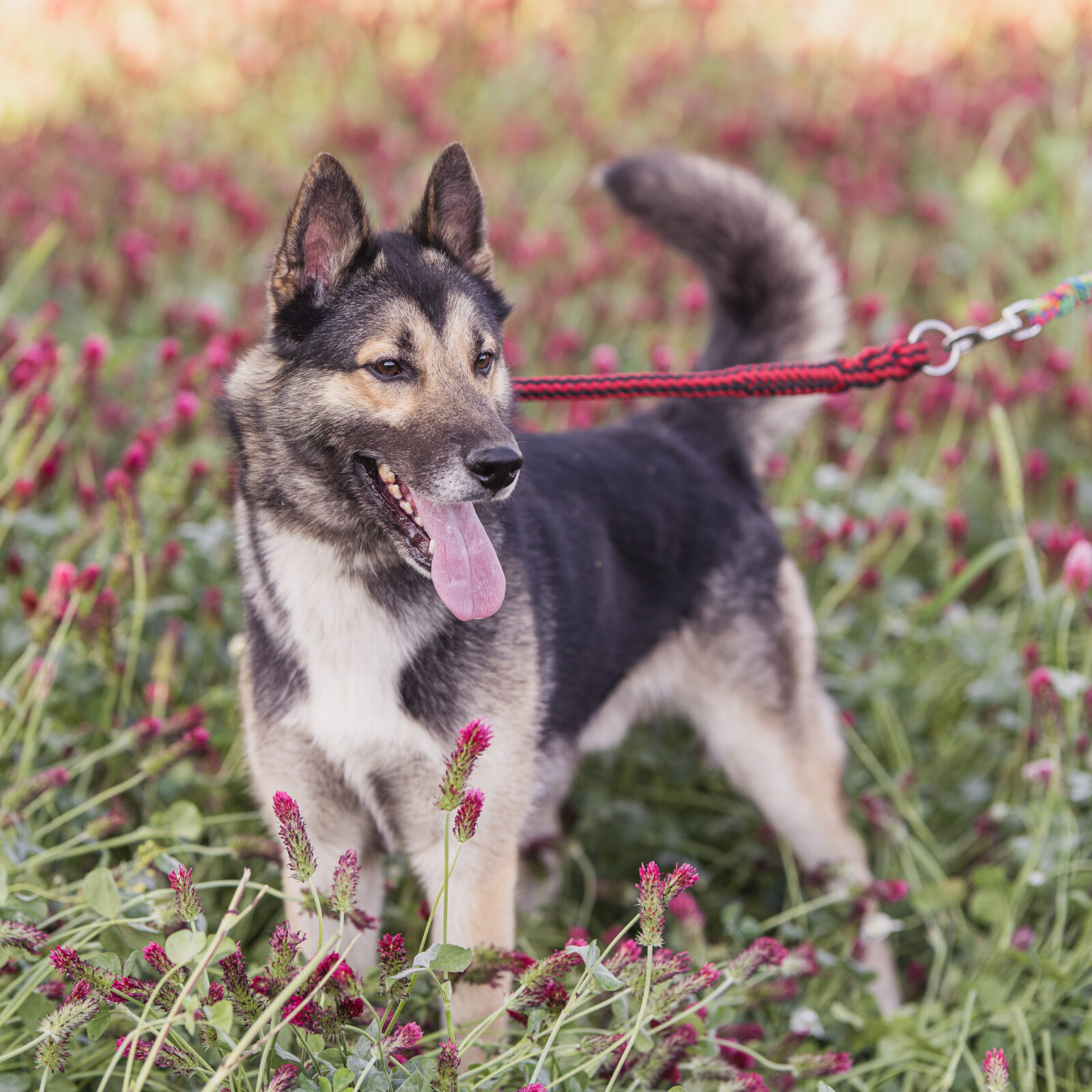Grimm je 1,5 letý kříženec pravděpodobně kolie a huskyho, váží 20 kg. Grimmík je aktivní pes, dokonalý parťák pro aktivnějšího člověka. U nás se velmi rychle projevil jako hodný, vítací a veselý pejsek, který rozdává úsměvy na všechny strany. Zpočátku je trochu lekavý a bojí se prudších pohybů, ale jen co ale zjistí, že mu nic špatného nehrozí, strach pomine. Na procházkách je Grimm nejšťastnější, nejraději by chodil hodiny a hodiny. Zajímají ho na nich kolemjdoucí i cyklisti, s každým by se šel seznámit. K jiným psům se snaží tahat, ale i to se lepší. Co se snášenlivosti týče, s fenami je bezproblémový, u psů určitě potřebuje delší čas na seznámení. Grimm k sobě hledá někoho, kdo s ním bude aktivně žít a bude počítat s tím, že ho v předešlém domově prakticky nic nenaučili, socializaci i výchovu už dohání u nás, stačí jen navázat na naši práci, Grimm ochotně spolupracuje.