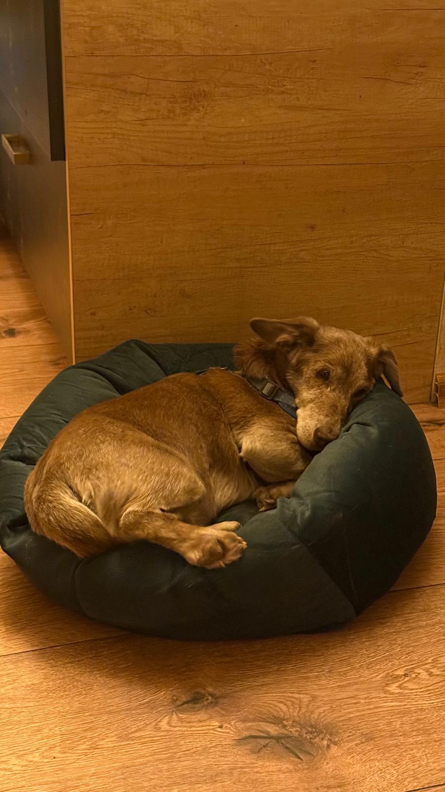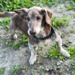 Ťopík je asi 12 letý kříženec jezevčíka. Váží 9 kg. Ťopíček je NESKUTEČNÝ. Nechodí. Má lézi na mozku (část mozečkové tkáně je nekrotická, pravděpodobně poúrazový stav). Postaví se na všechny 4, ale nohy nedokáže koordinovat.