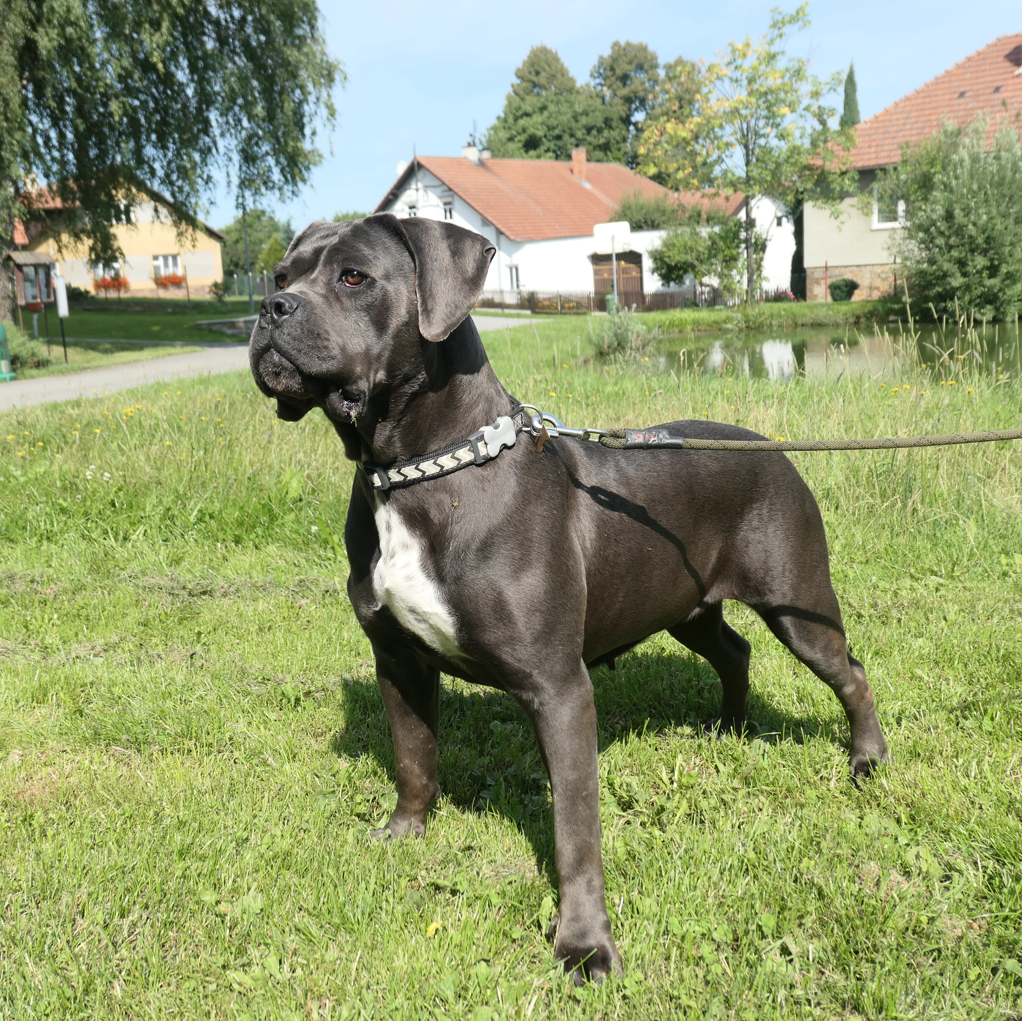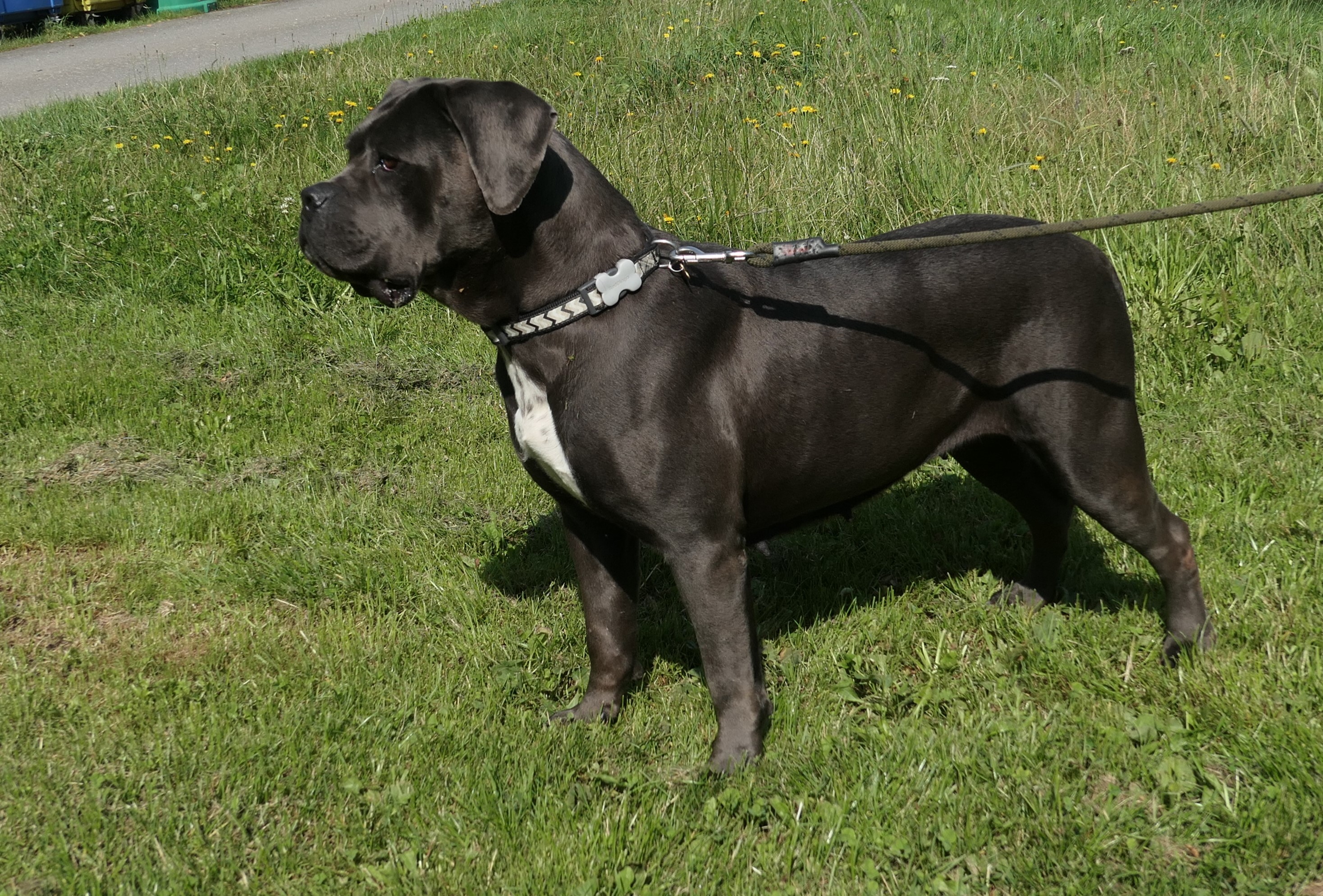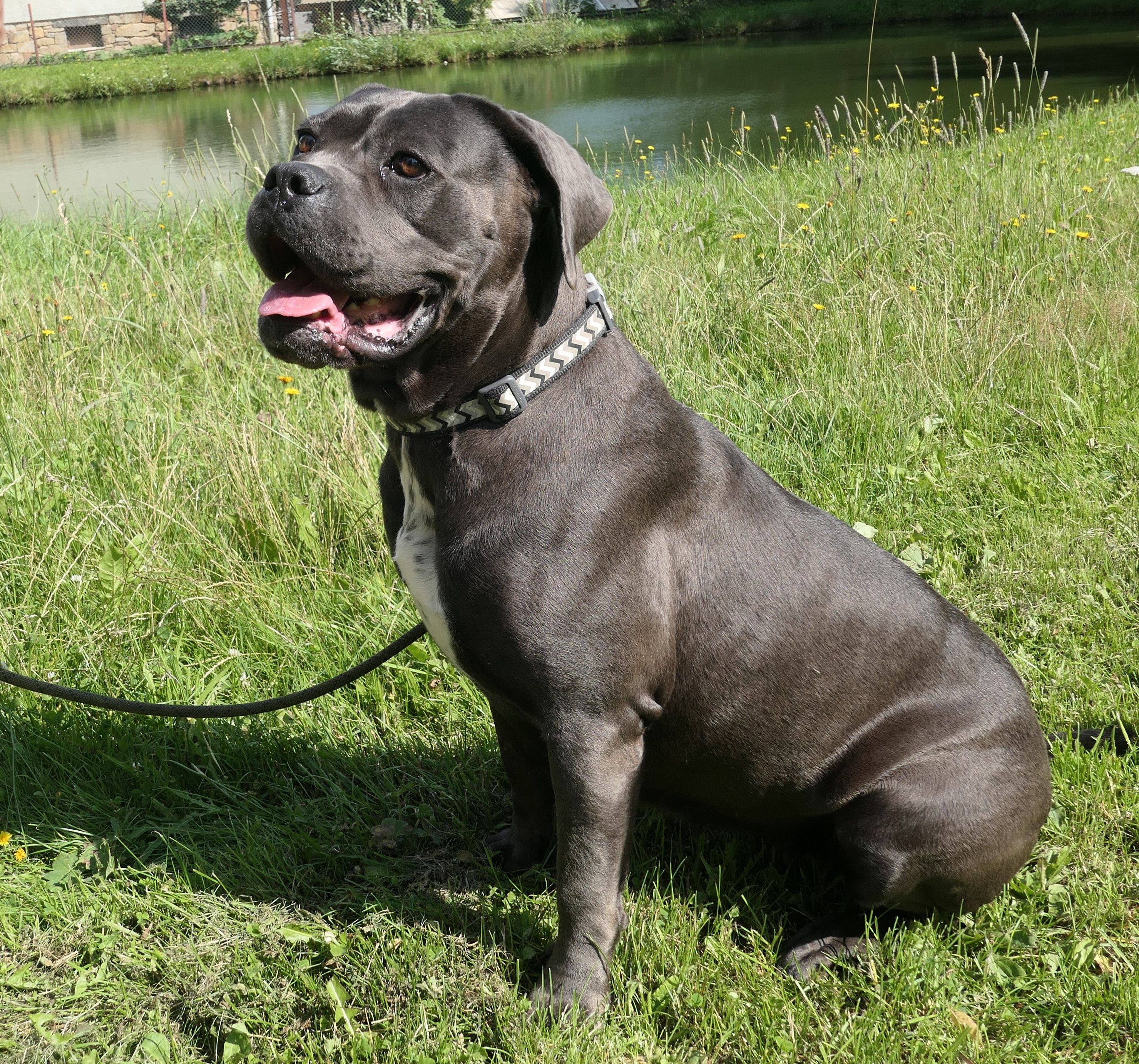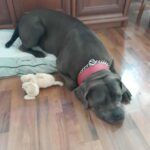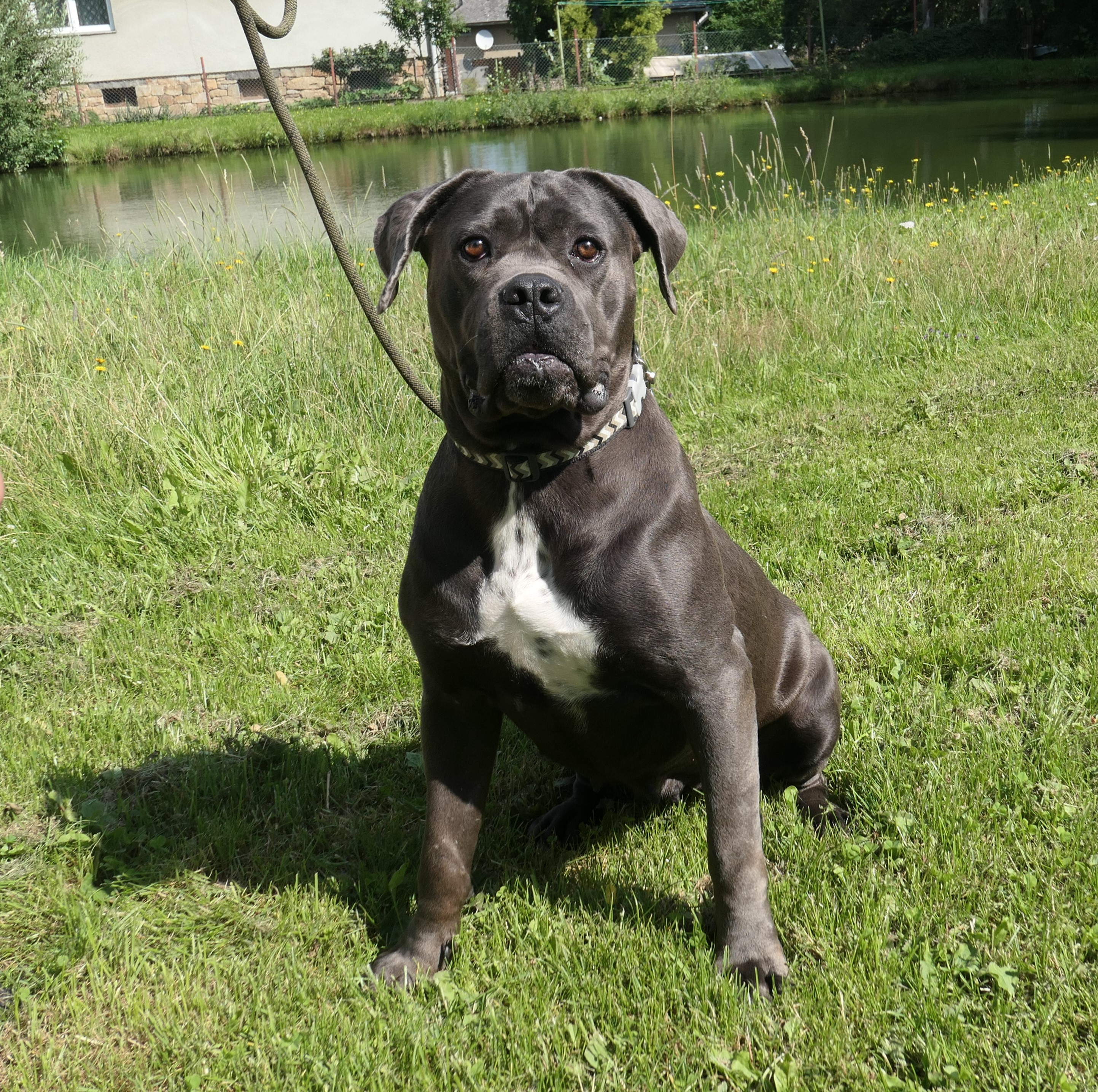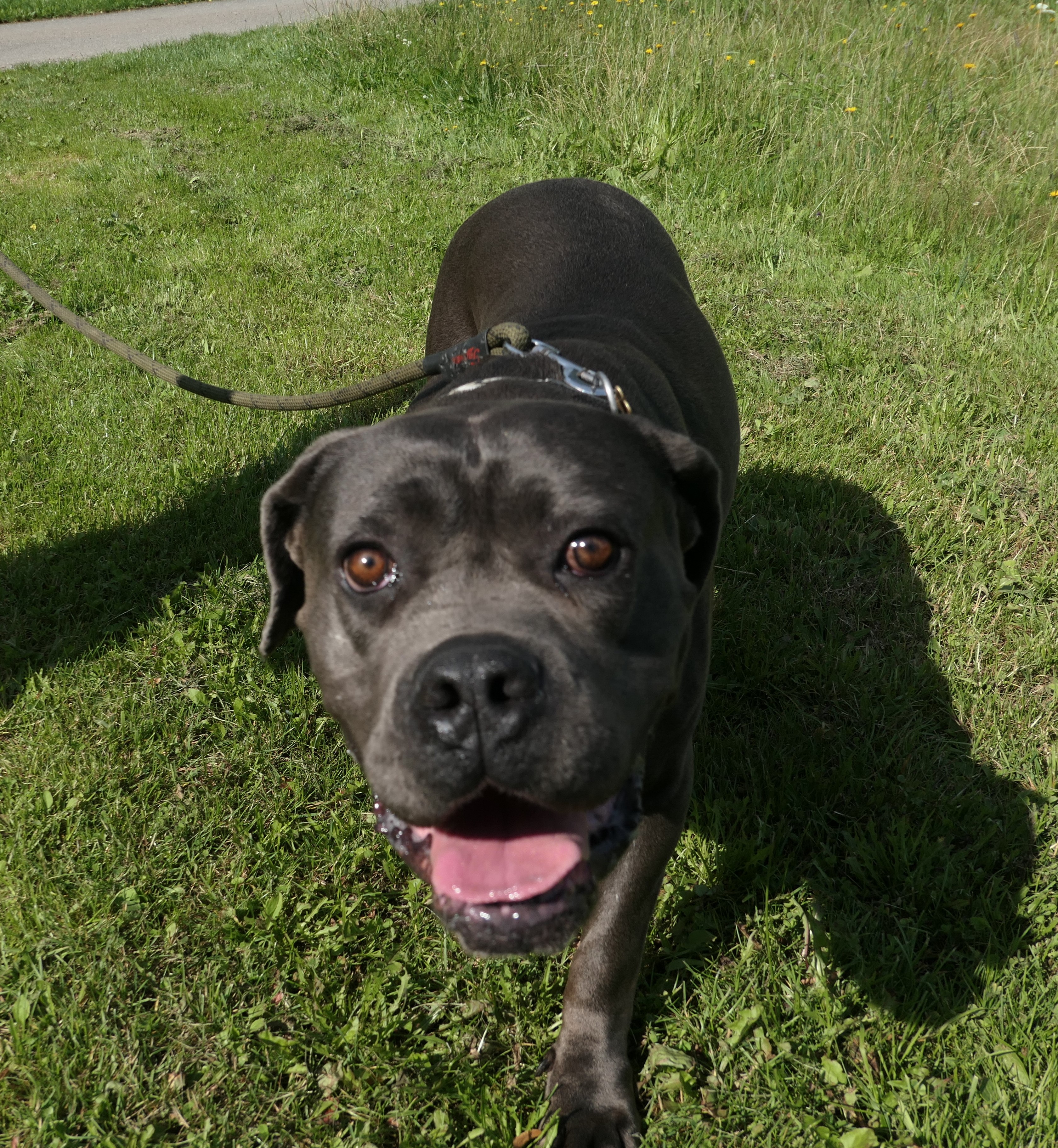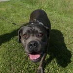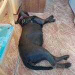 Bambule je asi 4 letá kříženka cane corso. Váží 47 kg. Bambule je úžasná. Jak je hodná, milá, veselá….jak se nadšeně roztančí a rozvlní své těžké tělo, když spatří člověka svého…Je naprosto odevzdaná, poslušná a jen čeká a dychtí, co ten její člověk udělá a kam se hne. Je to taková obří neškodná ťulpaska. S pejsky, fenkami a kočičkami vychází hezky, spíš vyjeveně kouká a čeká, ale trošku žárlí a vzhledem k tomu, že byla odchycena hárající se, je teď stejně první dny na samotce. Je čistotná, čeká spící a chrápající na svého pána doma.