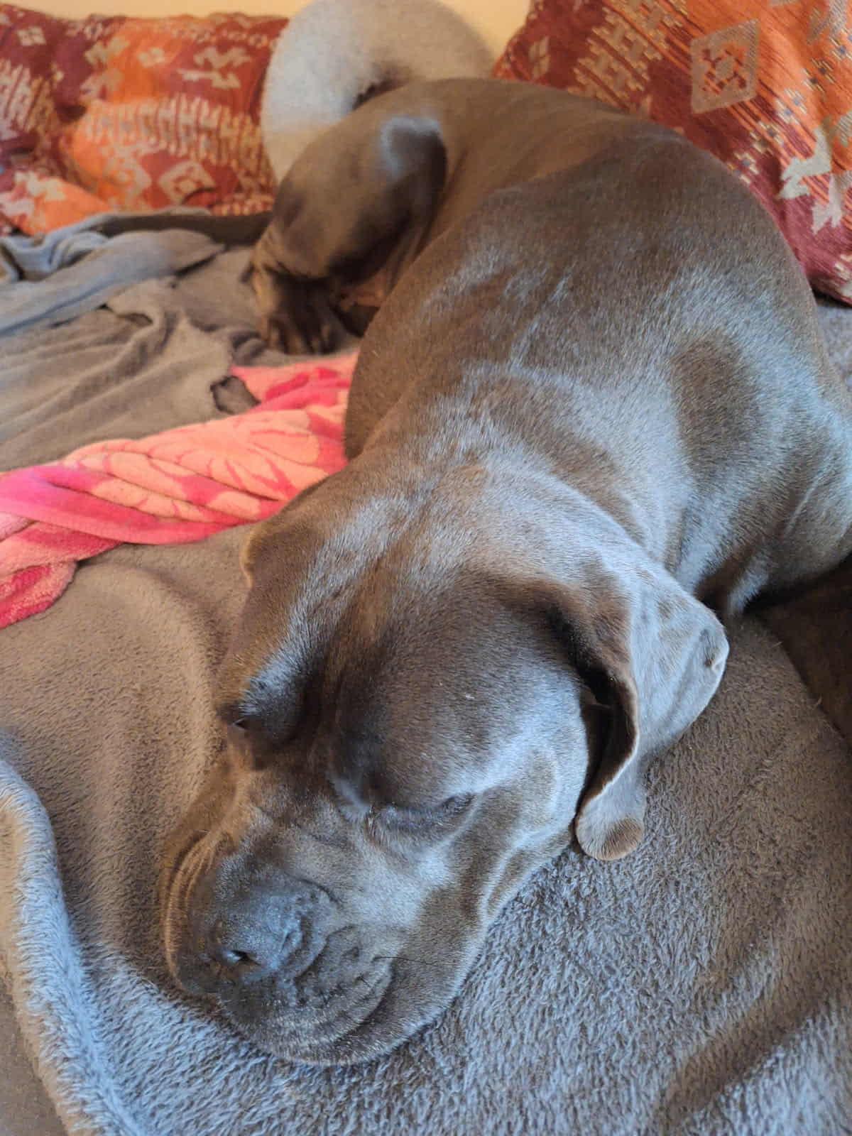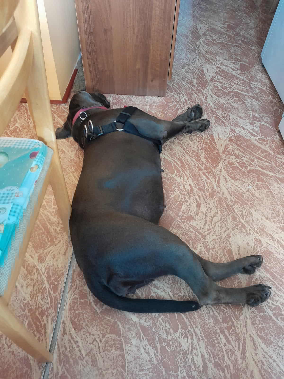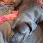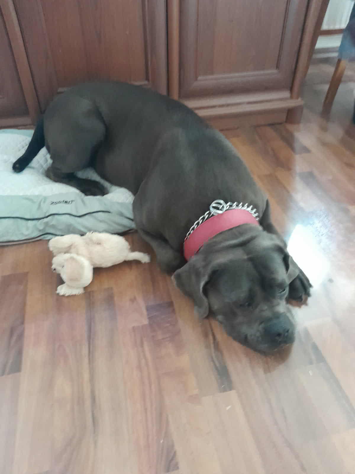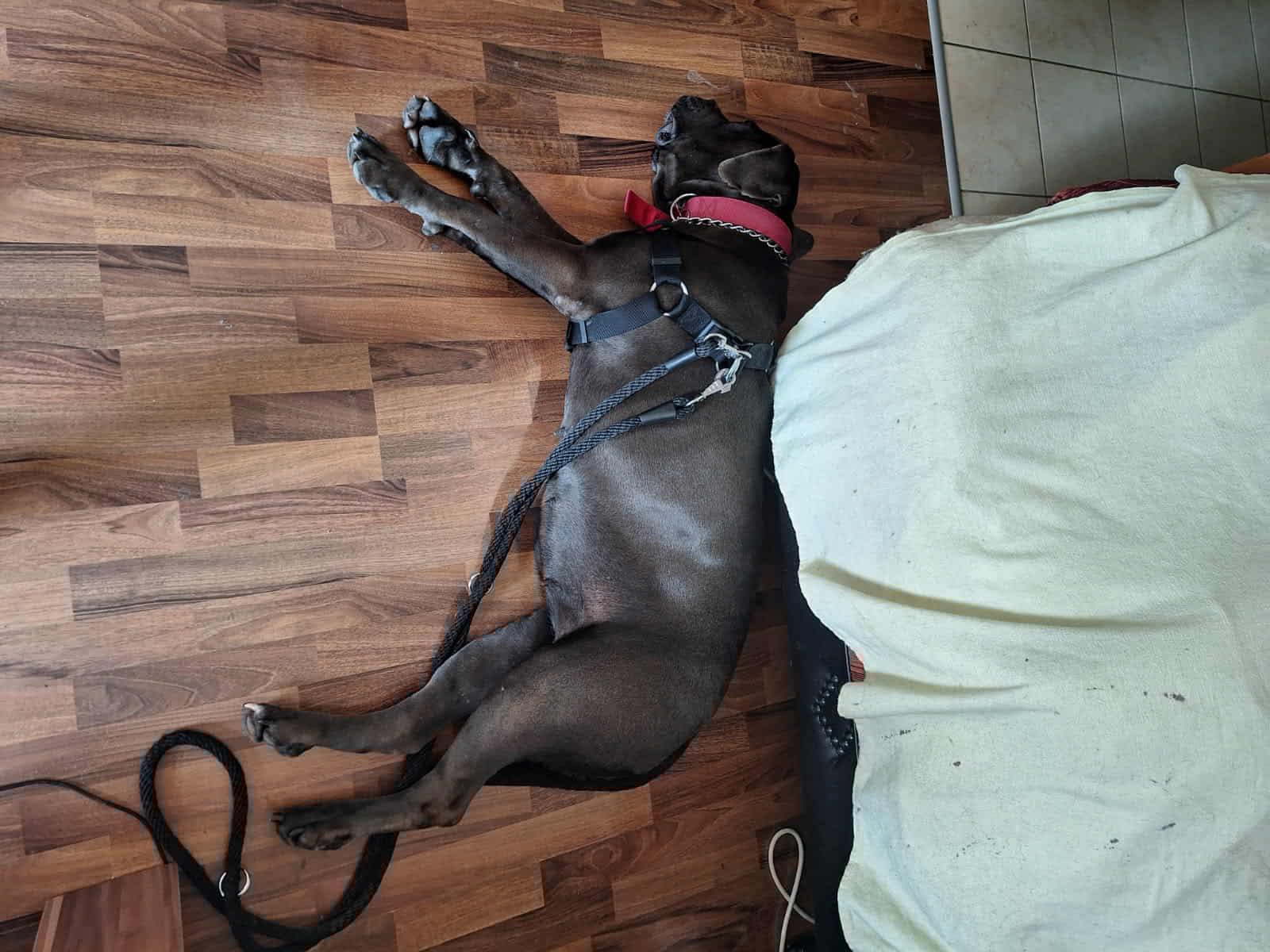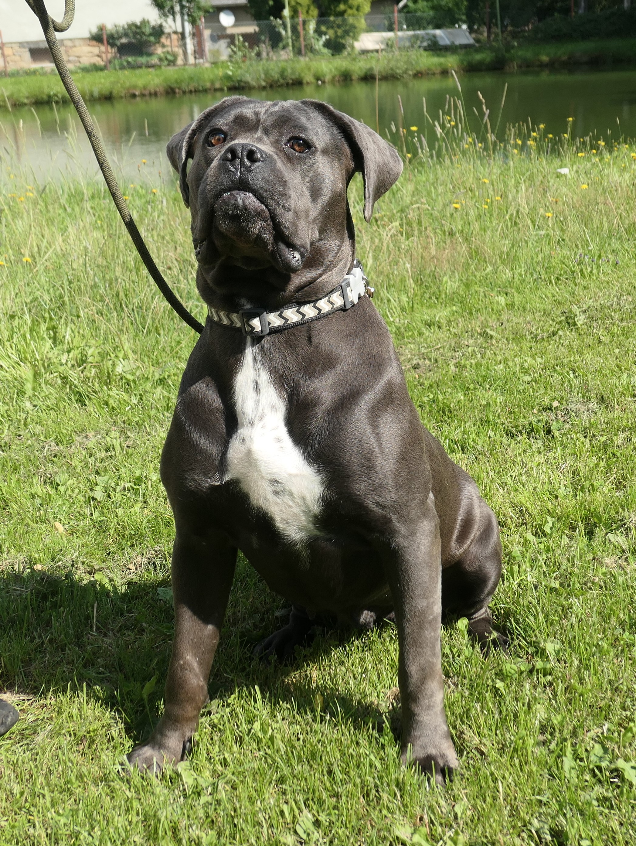 Bambule je asi 4 letá kříženka cane corso. Váží 47 kg. Bambule je úžasná. Jak je hodná, milá, veselá….jak se nadšeně roztančí a rozvlní své těžké tělo, když spatří člověka svého…Je naprosto odevzdaná, poslušná a jen čeká a dychtí, co ten její člověk udělá a kam se hne. Je to taková obří neškodná ťulpaska. S pejsky, fenkami a kočičkami vychází hezky, spíš vyjeveně kouká a čeká, ale trošku žárlí a vzhledem k tomu, že byla odchycena hárající se, je teď stejně první dny na samotce. Je čistotná, čeká spící a chrápající na svého pána doma.