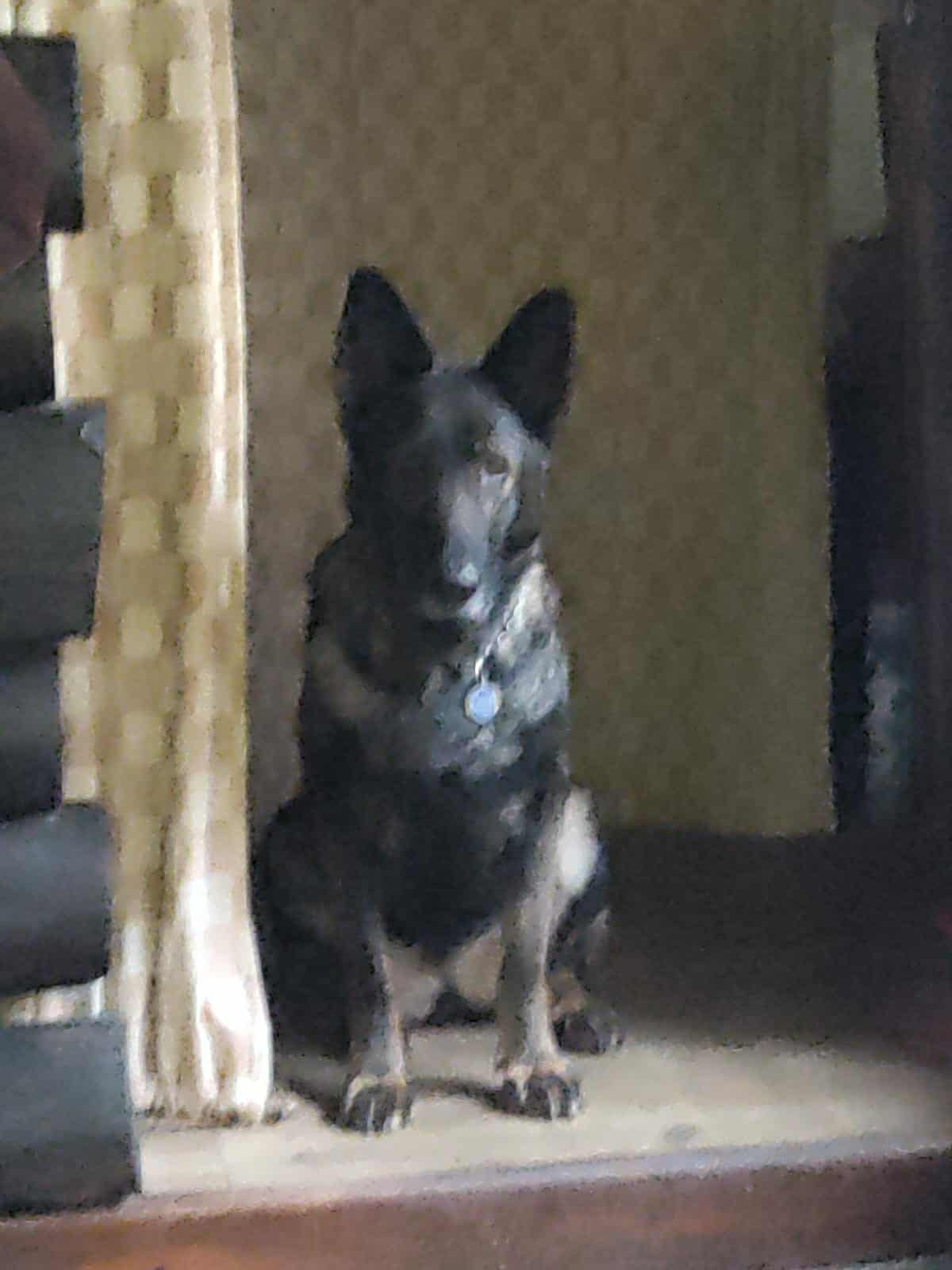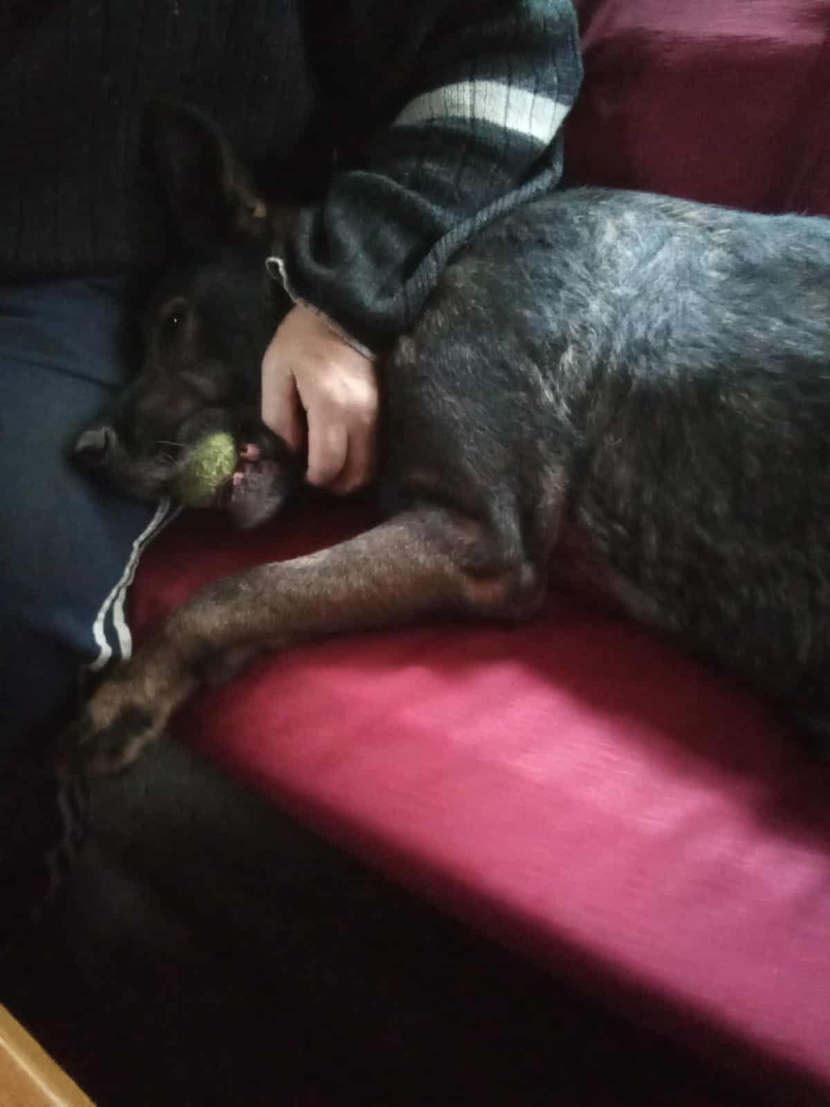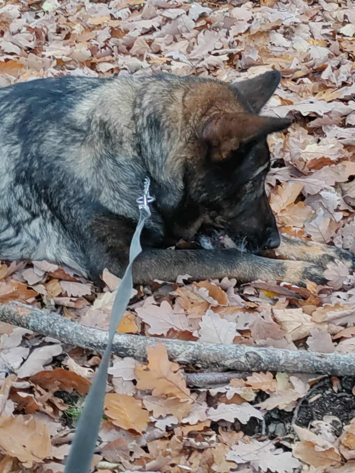 V předchozím domově si bohužel navykla řešit stresující situace štěkotem a točením se dokola za ocasem. Venku řešíme chůzí u nohy, čímž se okamžitě přestane točit; doma povelem sedni a odvedením pozornosti.